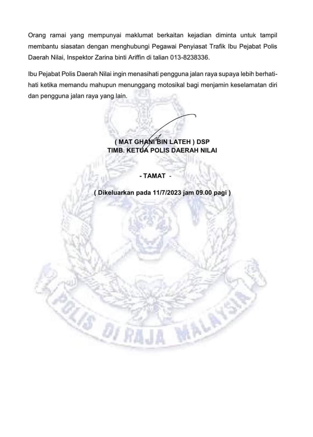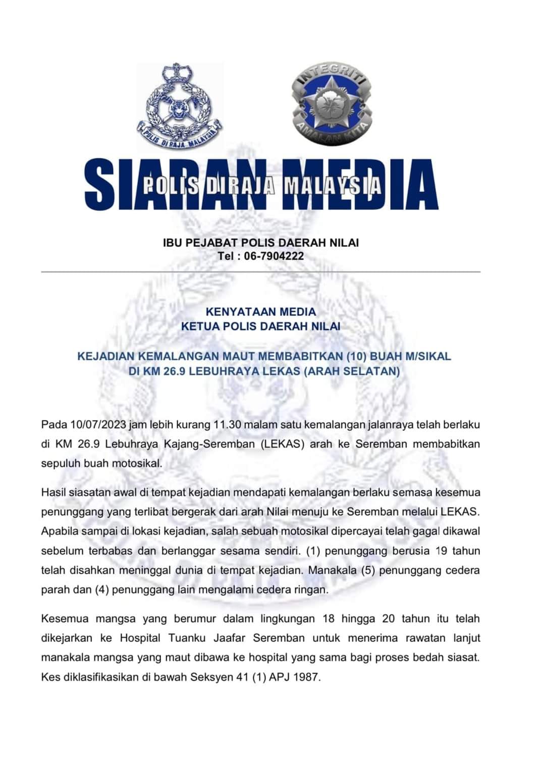 Ketua Polis Daerah Nilai, Mat Ghani berkata, kejadian ini berlaku pada jam 11.30 malam, 10 Julai di KM26.9 Lebuhraya Kajang-Seremban (LEKAS) membabitkan 10 motosikal.