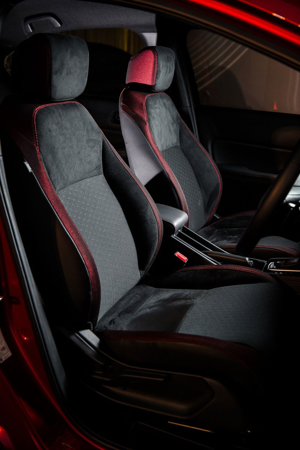 5. Ruang kabin menggunakan material sued dan kemasan aksen merah. Konsol tengah menggunakan plastik hitam Piano Black dan dihidangkan unit infotainment skrin sentuh 8 inci dengan konektiviti Apple CarPlay dan Android Auto, serta sokongan arahan suara SIRI.