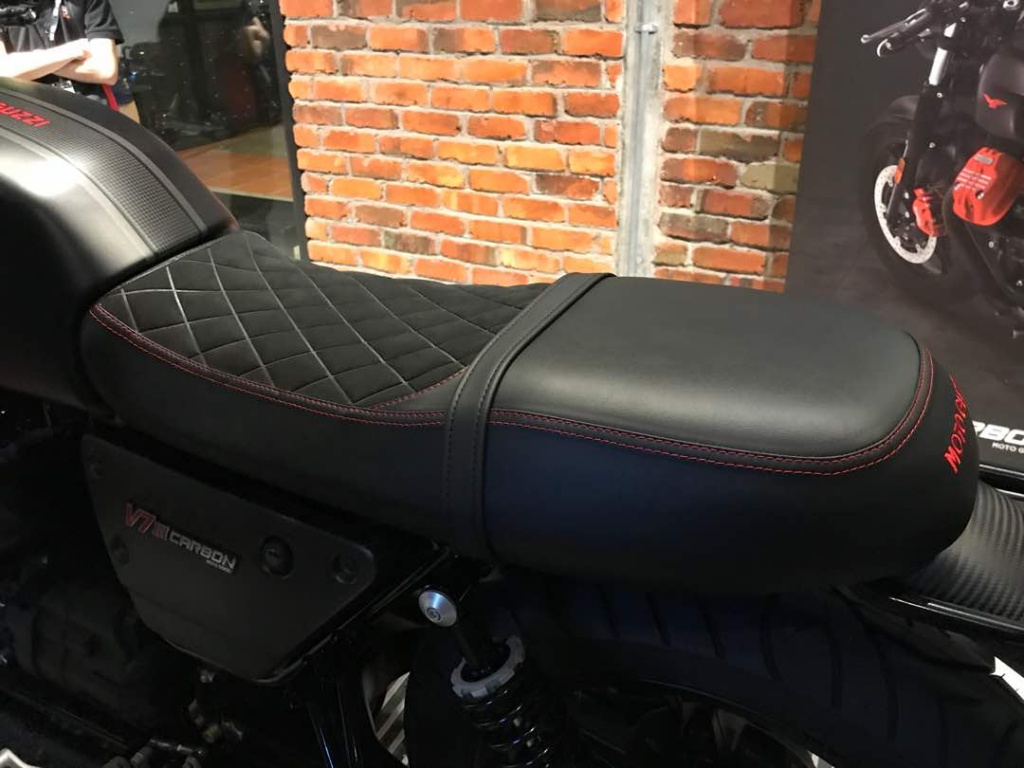 4. Moto Guzzi menawarkan pelana kalis air Alcantara dengan jahitan benang merah.