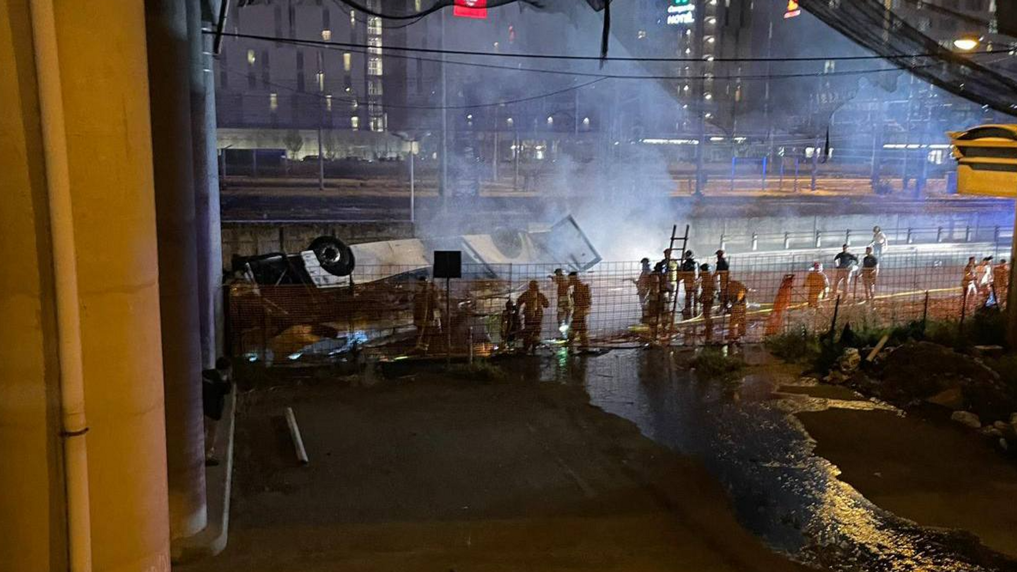 Bas tersebut juga dilaporkan terbakar selepas terjunam. Pasukan keselamatan kini di tempat kejadian untuk kerja-kerja menyelamat.