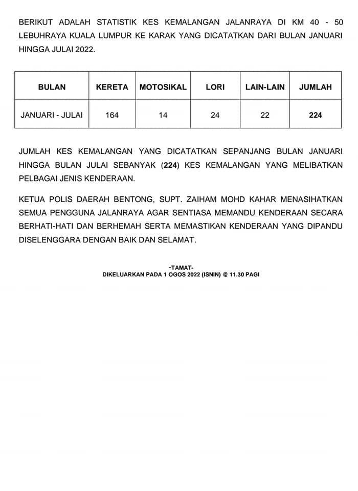 POLIS mendedahkan 224 kes kemalangan jalan raya berlaku antara KM40 hingga KM50 Lebuhraya Kuala Lumpur-Karak sepanjang tempoh tujuh bulan pertama tahun ini.