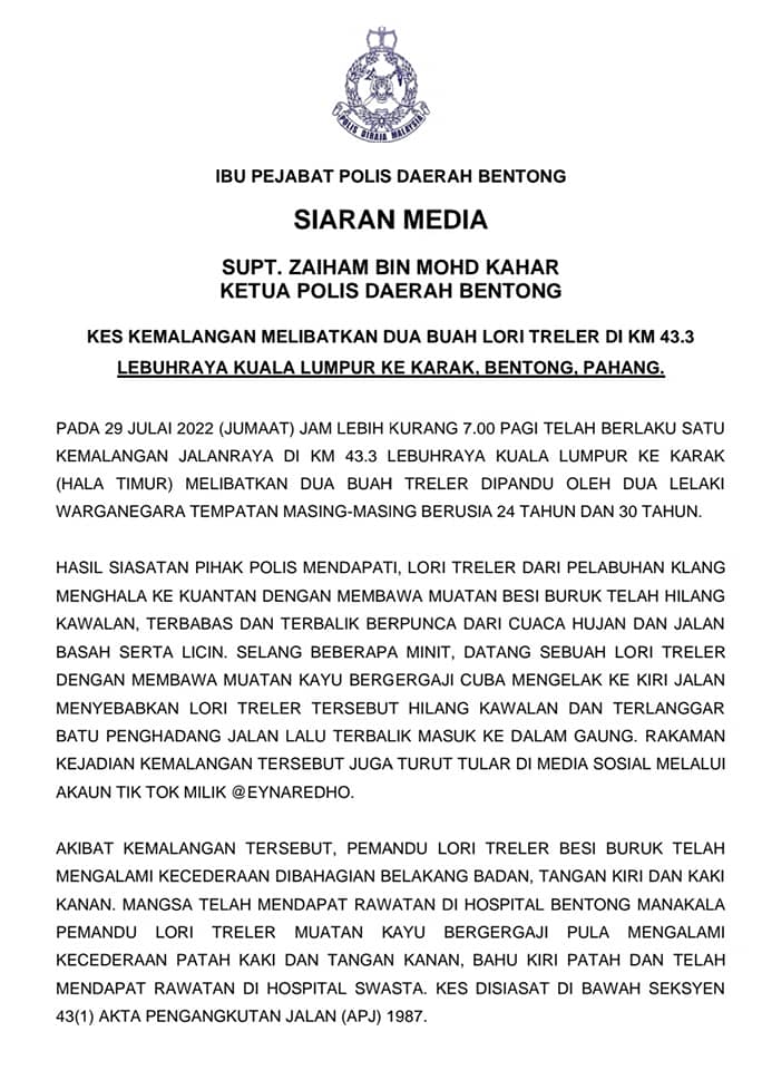 Insiden kemalangan terbaharu adalah pada Jumaat lalu (29 Julai) membabitkan dua treler dipandu warga tempatan, masing-masing berumur 24 dan 30 tahun, dekat KM43.3 Lebuhraya KL-Karak, menghala timur.