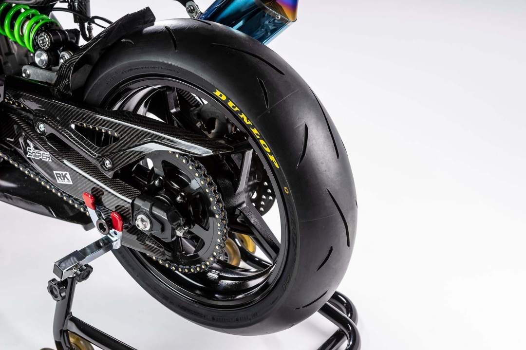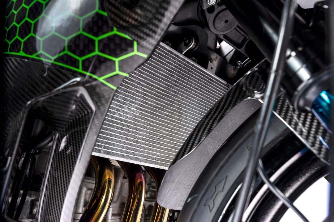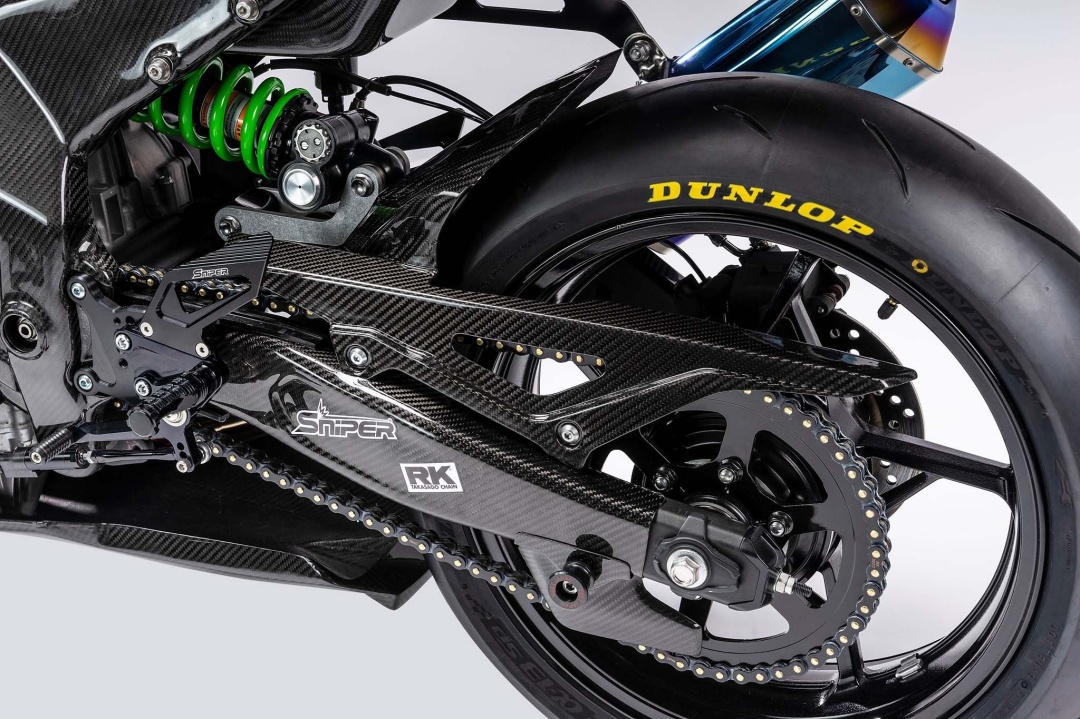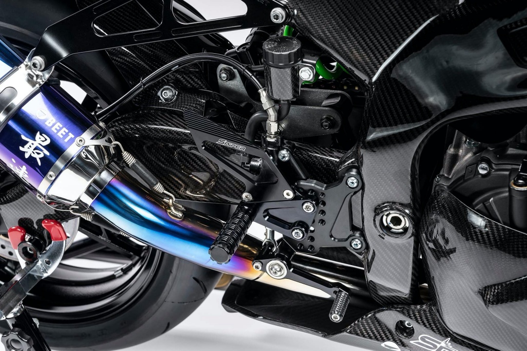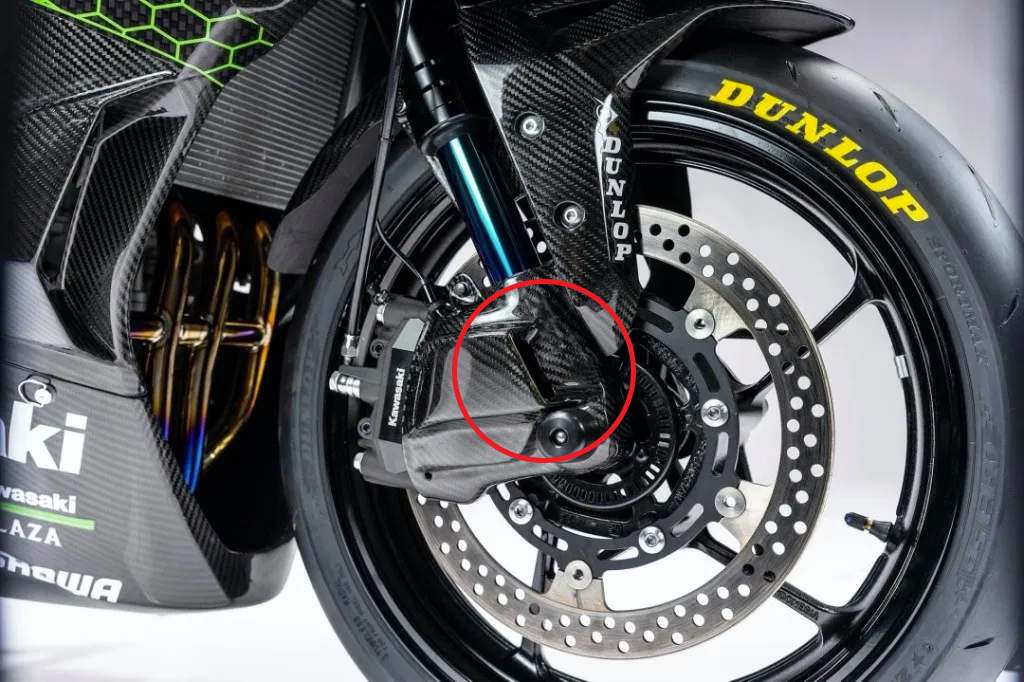 Kelihatan juga ventilator khas pada roda depan yang berfungsi menyuapkan udara untuk menyejukkan kaliper. Sistem suspensi menggunakan unit monchock Back Link dan fork Showa ZX-10R . Masih belum dipastikan adakah itu komponen asli atau sekadar pasang siap (plug and play).