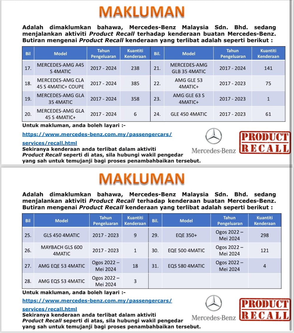 Dua keping foto yang dikongsi JPJ itu menyenaraikan sebanyak 31 model kenderaan jenama Mercedes-Benz membabitkan sebanyak 10,978 unit kenderaan keluaran tahun 2017 sehingga Mei 2024.
