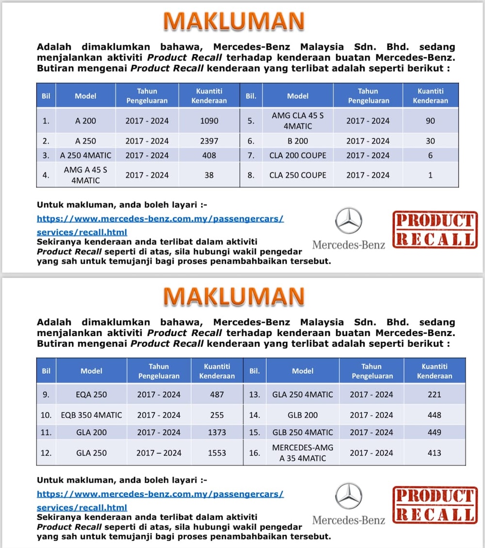SATU lagi jenama kenderaan terlibat dalam kempen panggilan balik iaitu Mercedes-Benz selain Toyota dan dua jenama motosikal iaitu Honda dan Suzuki.