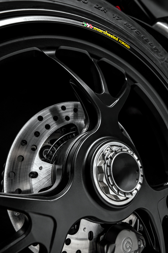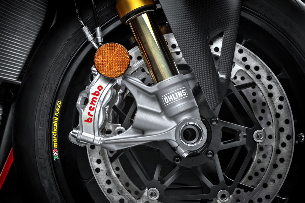 - Sebagai jentera trek, suspensi depan menggunakan fork Öhlins 43 mm NPX 25/30 dan absorber Öhlins TTX36 (belakang) yang kedua-duanya memiliki ciri pelarasan mekanikal. Melengkapkan tetapan suspensi ialah rim aluminium hitam penuh.