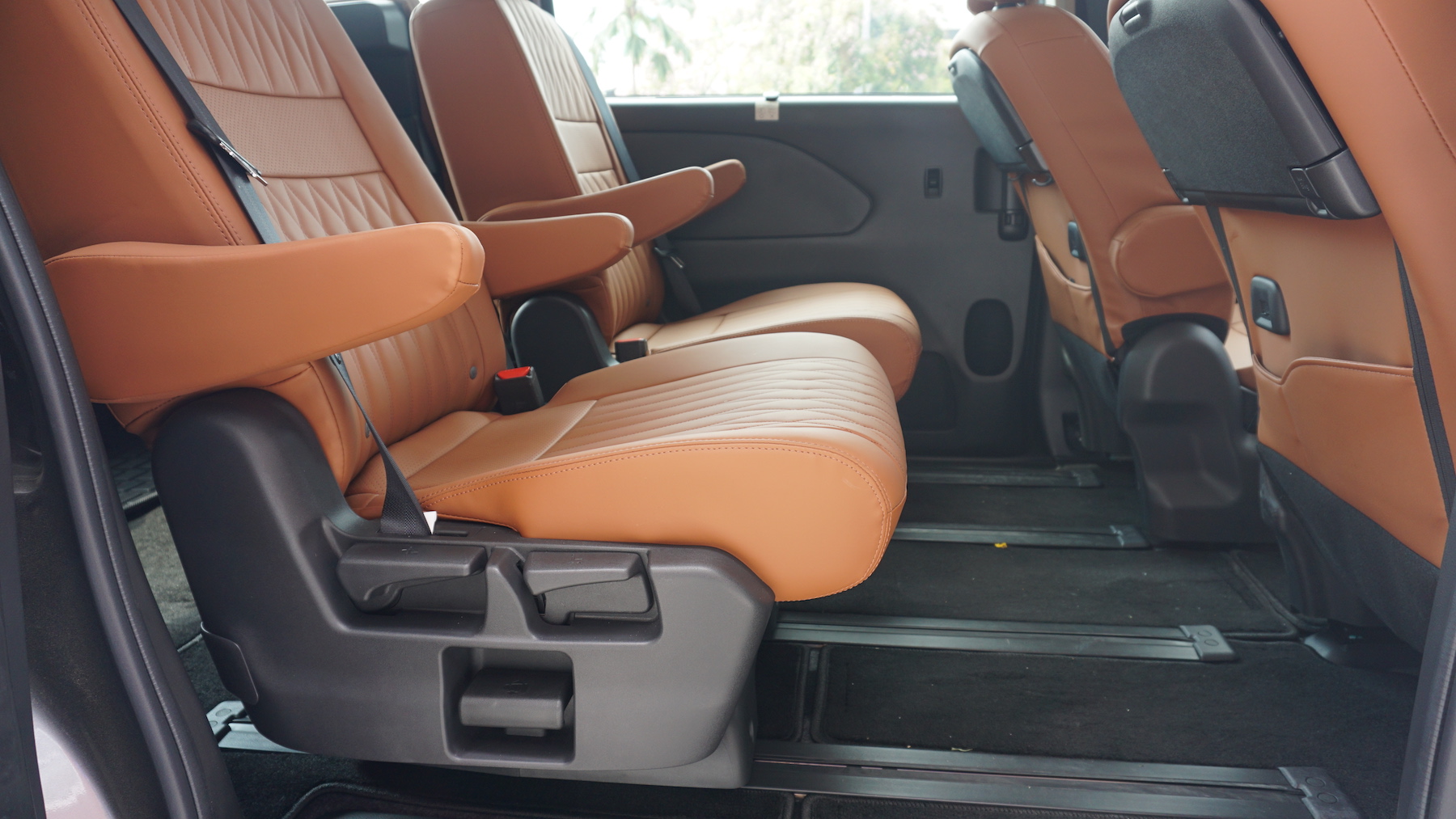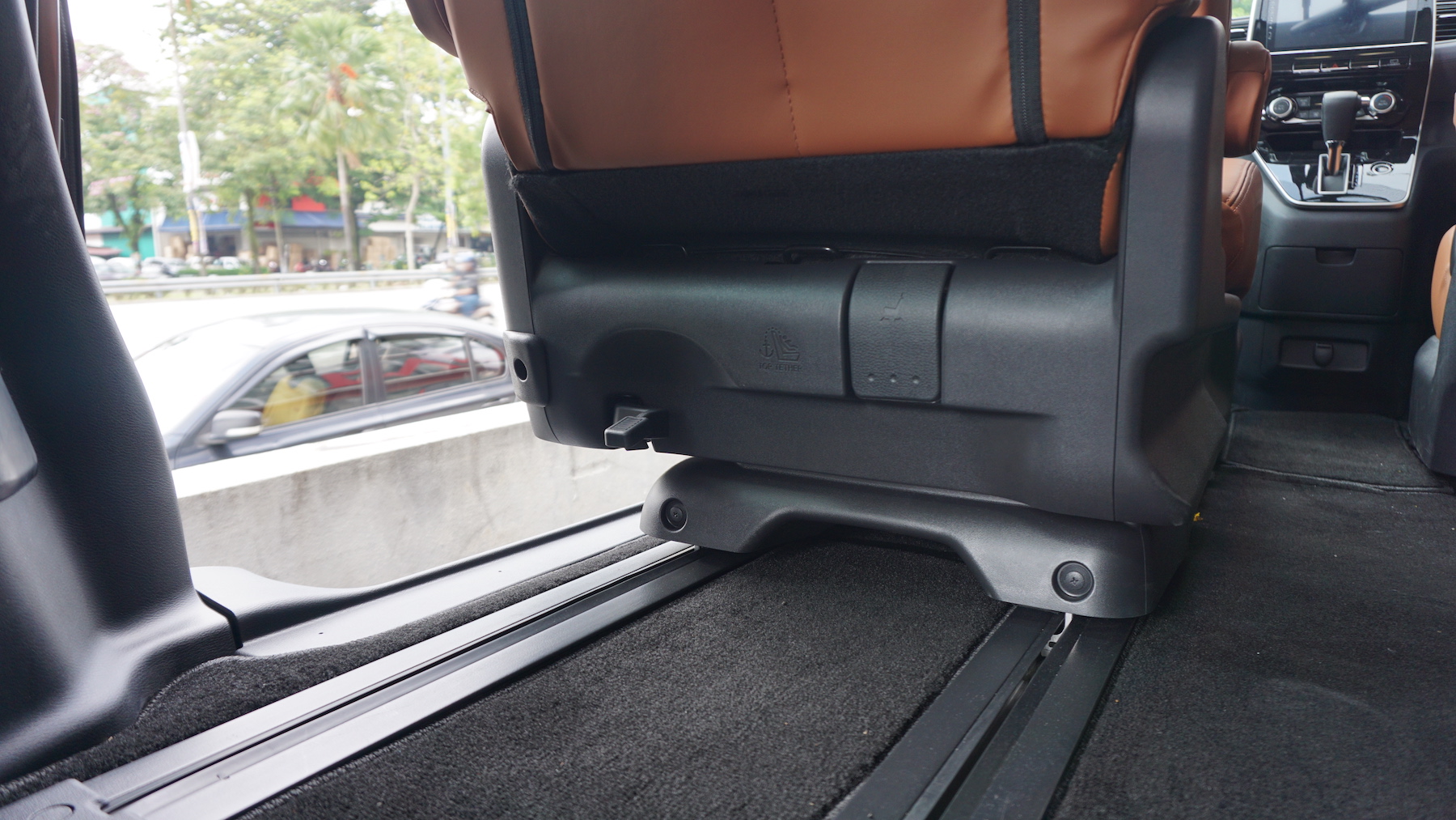 Pertama, ada suis Butang Kawalan Pintu Gelangsar Berkuasa di sebelah kiri. Kedua, ada pedal khas di belakang kerusi barisan kedua untuk memudahkan penumpang belakang (baris ketiga) keluar dari kabin.