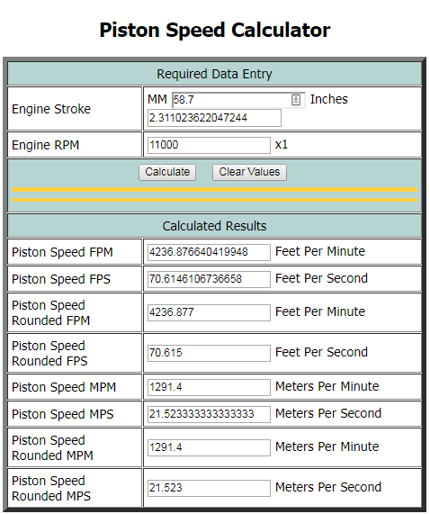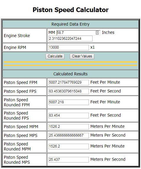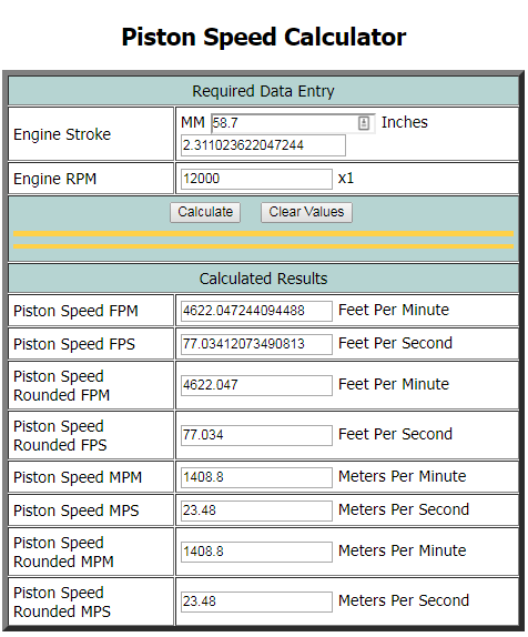 Jika mahu mengetahui seberapa tinggi enjin boleh dikerah, kita boleh teruskan pengiraan dengan menukar nilai RPM secara berperingkat dengan perbezaan 1,000rpm setiap satu hingga mencapai nilai maksimum julat kelajuan piston motosikal, iaitu sekitar 25ms.