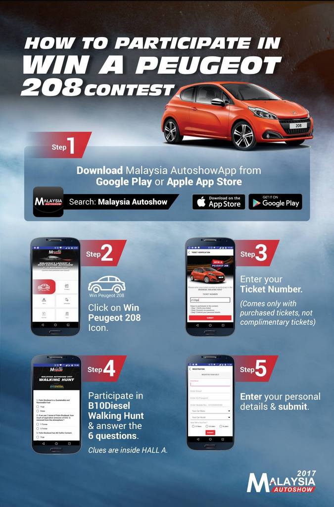 Dengan membeli tiket RM10, secara automatik anda layak memenangi hadiah utama berupa Peugeot 208 PureTech. Caranya mudah, anda hanya perlu mengisi butiran diri dan jawab beberapa soalan mudah menerusi aplikasi Malaysia Autoshow.