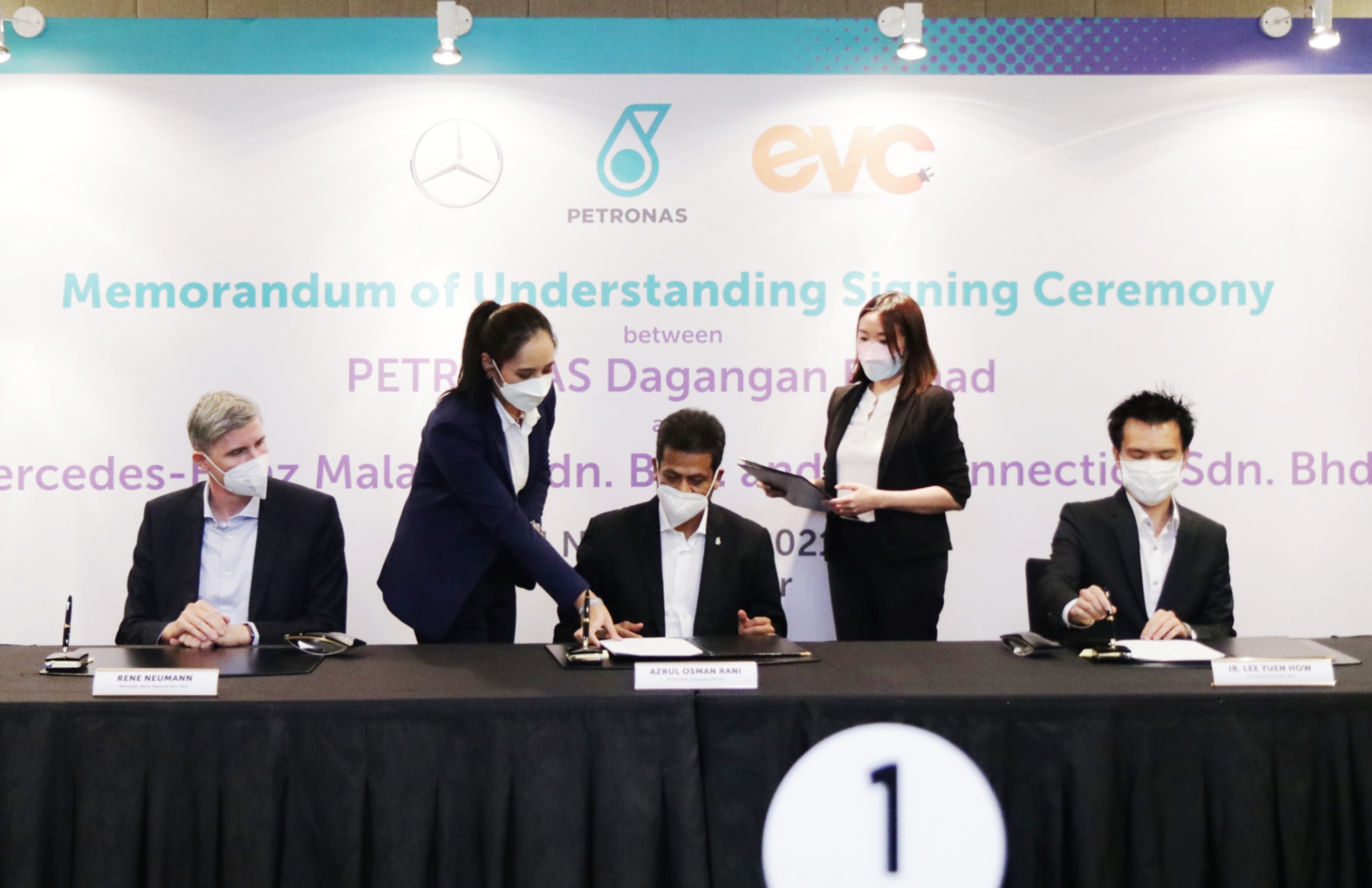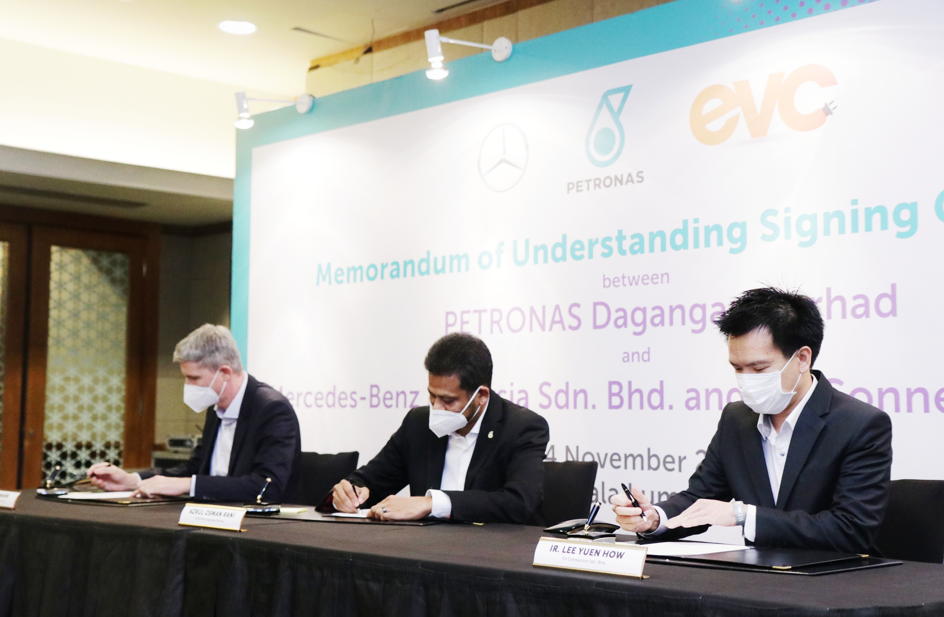 PETRONAS Dagangan Bhd (PDB) menandatangai memorandum persefahaman (MoU) dengan Mercedes-Benz Malaysia (MBM) dan EV Connection (EVC) untuk mewujudkan pengecas pantas arus terus (DC) untuk kenderaan elektrik (EV) di stesen Petronas menjelang penggal pertama 2022.
