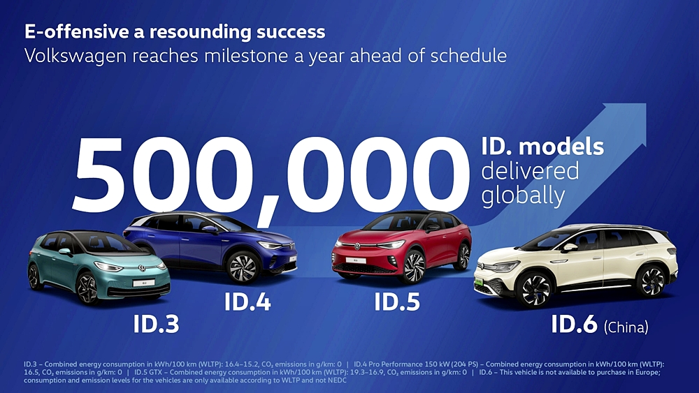 Sejak penyerahan pertama Volkswagen ID.3 pada Oktober 2020, pengeluar dari Jerman itu sudah menyerahkan 500,000 unit pelbagai model ID. kepada pelanggan serata dunia. Angka itu dicapai walaupun berdepan cabaran bekalan. Menariknya, ia dicapai lebih awal daripada tahun sasaran – 2023!