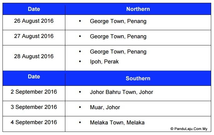 Bagi anda yang mahu melihat lebih dekat lagi, Honda Malaysia bakal mengadakan siri jelajah bermula 12 Ogos hingga 4 Sepetember 2016 di beberapa lokasi terpilih. Senarai lokasi rujuk jadual di bawah;