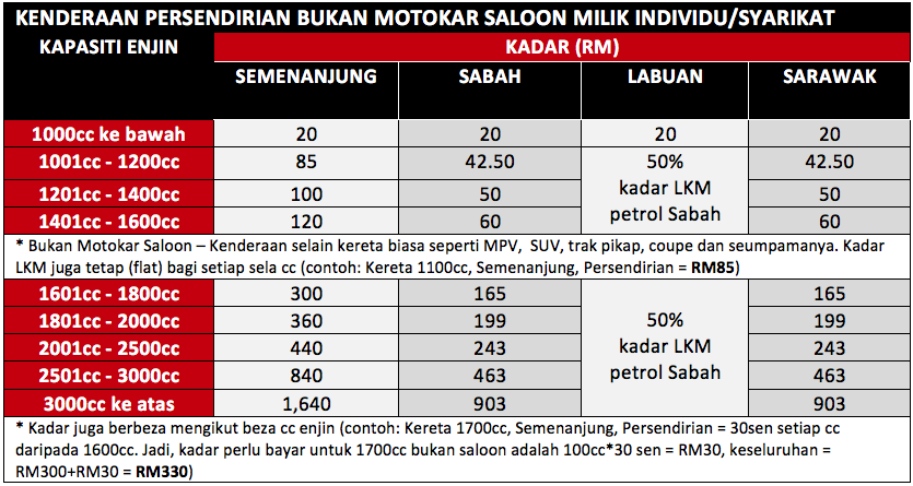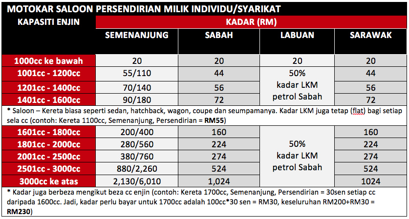 * Bagi kadar 1000cc dan ke atas, ada tambahan sen bagi setiap sela cc, tetapi tidak dinyatakan dalam jadual di atas. Boleh rujuk butiran lengkap di SINI.