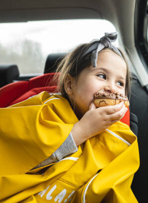 Cara terbaik, benarkan mereka makan kudapan atau jajan sebelum naik kereta dan berikan permainan sebagai hiburan. Jika anak masih mahu makan, berikan makanan yang tidak berisiko untuk tercekik seperti yogurt.