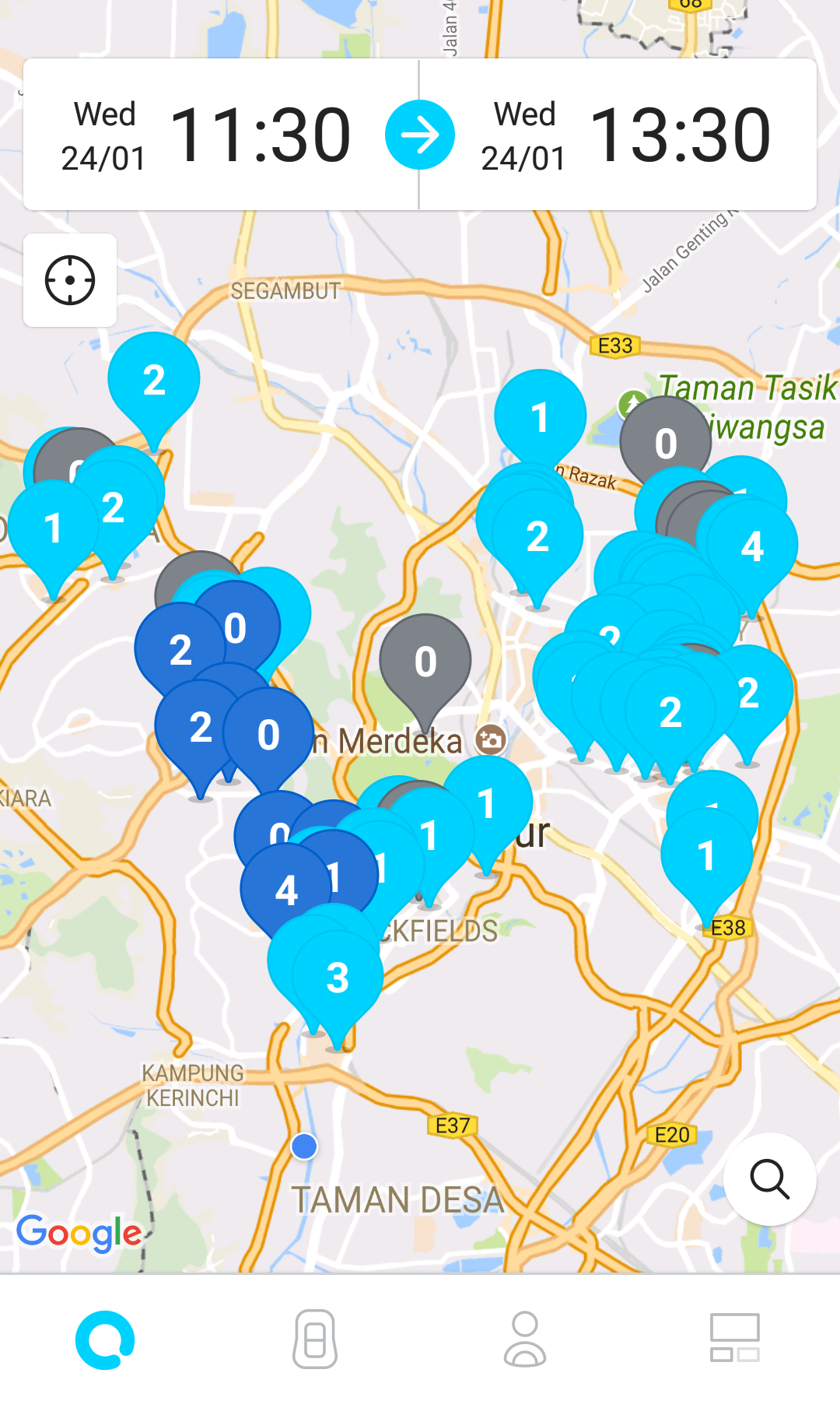 Selepas pendaftaran sah, anda kini boleh lihat lokasi kereta sewa SOCAR (dipanggil SOCAR Zone) sekitar Lembah Klang (ada 100 lokasi) yang ditandakan dalam warna biru muda. Kemudian: