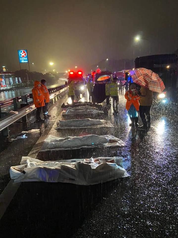 - 1 perempuan dewasa dan lapan anak (terdiri daripada lima kanak-kanak lelaki dan tiga kanak-kanak perempuan, termasuk bayi 10 bulan) dalam satu lagi Wira. Terperosok bawah treler.