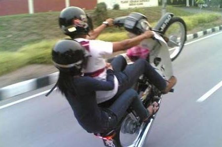 ADA orang, setiap kali mahu membonceng, mesti dia minta si penunggang sengetkan sikit motosikal supaya senang mahu naik dan duduk. Tetapi ingat, jangan ikut!
