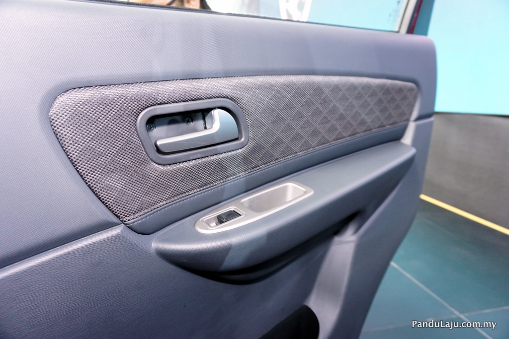 Set upholsteri diperbaharui dengan kemasan semi-kulit bertekstur corak silang pada kerusi dan panel pintu, manakala kluster meter menampilkan fon lebih kemas warna putih. Tiada perubahan dimensi atau susunan konfigurasi kerusi dibuat.