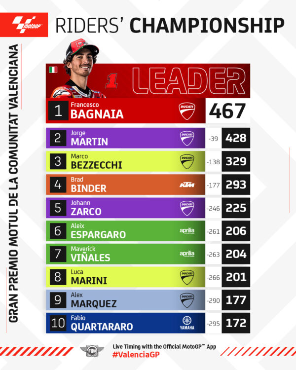 Bagnaia bermula di grid pertama GP Valencia selepas Maverick Vinales (Aprilia Racing) dihukum penalti sebelum perlumbaan. Beliau kelihatan agresif untuk mendapatkan rentak selepas diasak ekstrem oleh Martin seawal beberapa pusingan perlumbaan.