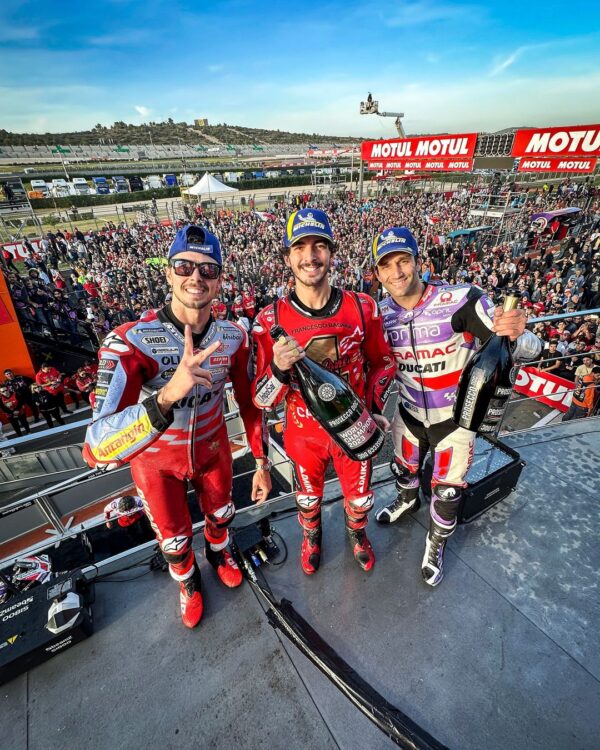 Musim akhir MotoGP 2023 kali ini mencatatkan sejarah menarik apabila tiga jentera Ducati menakluki podium. Namun, Di Giannantonio diturunken ke tempat keempat selepas dikesan melanggar syarat tekanan tayar, manakala Binder naik podium ketiga.
