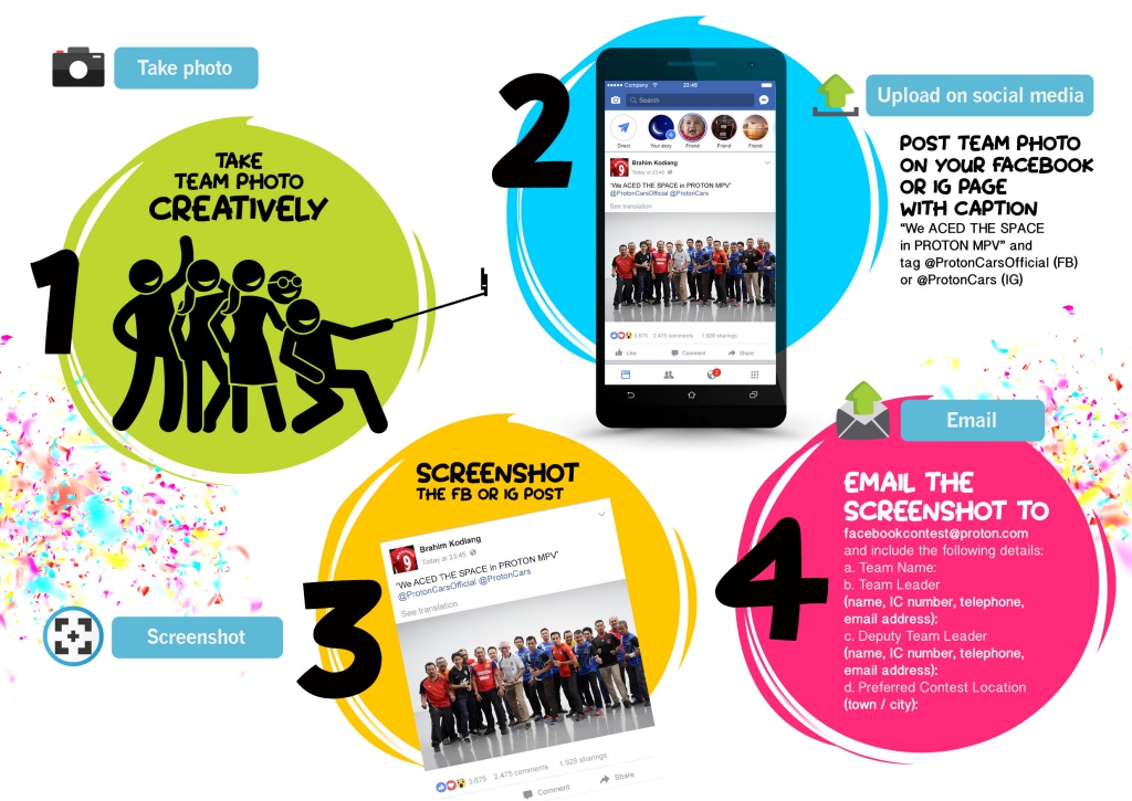2. MUAT NAIK DALAM FACEBOOK: Muat naik dalam laman sosial anda dengan kapsyen, “Kami ACED THE SPACE dalam PROTON MPV” dan tag @ProtonCarsOfficial (Facebook) atau @ProtonCars (Instagram).