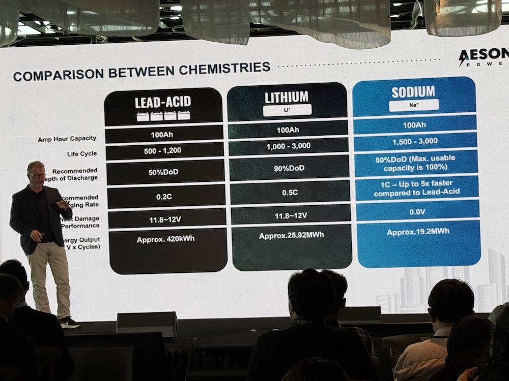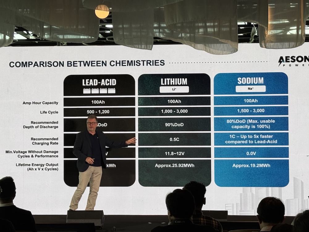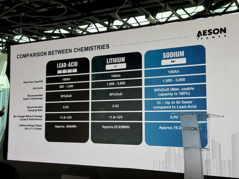 Dari segi ketahanan, bateri sodium-ion Aeson Power menawarkan hingga 3,000 kitaran pengecasan pada kedalaman nyah cas (DoD) 50 peratus, berbanding 500 – 1,200 kitaran bagi bateri asid plumbum biasa.