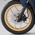 - Menggunakan sistem brek kombi (CBS) yang menggabungkan kombinasi brek cakera dengan kaliper piston tunggal di depan dan brek dram di belakang.
