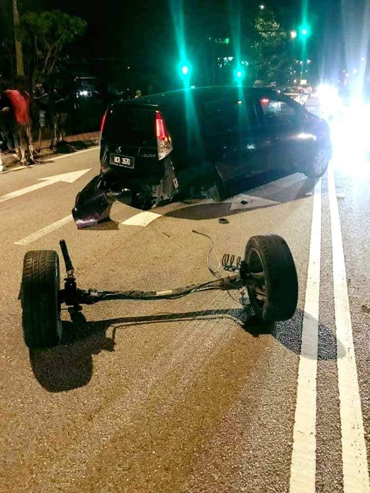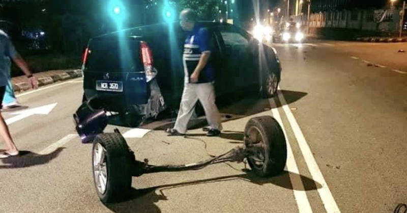 GANDAR belakang, termasuk kedua-dua tayar sebuah kenderaan pelbagai guna (MPV) Perodua Alza tercabut selepas bergesel dengan Proton Exora dalam kemalangan di Negeri Sembilan, malam semalam. Insiden berlaku kira-kira jam 9.30 malam di Kilometer 1.5 Jalan Tampin ke Seremban di depan Sekolah Menengah Tunku Besar Tampin.