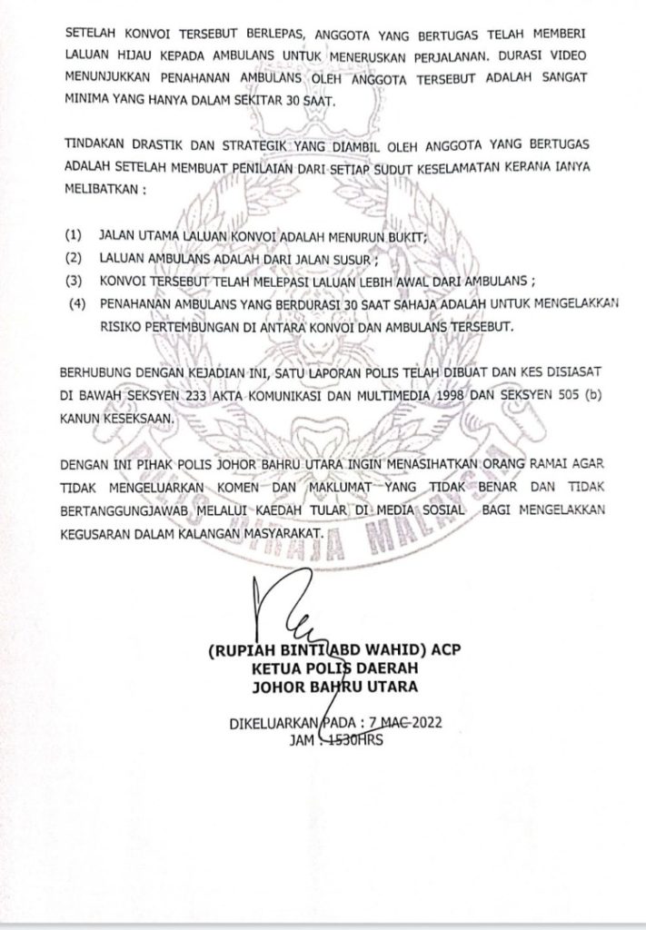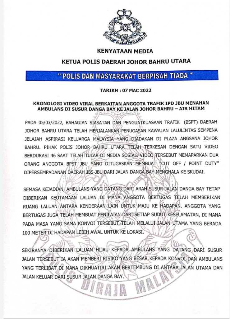 Demikian penjelasan Ketua Polis Daerah Johor Bharu Utara, Rupiah Binti Abd Wahid menerusi kenyataan media yang dikeluarkan susulan tular video polis trafik menahan ambulans, semalam.
