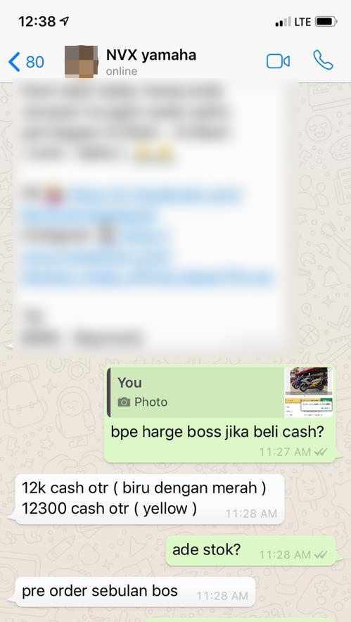 Daripada 10 kedai motor, hanya satu premis saja (di Pantai Timur) yang ada stok NVX kuning. Itupun harga cecah RM13,300 (gulppp…). Harga paling murah sepanjang survei saya ialah RM11,900, tetapi kenalah sabar menunggu lima pembeli dalam senarai. Lagi satu, perlu bayar cash!