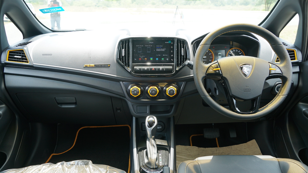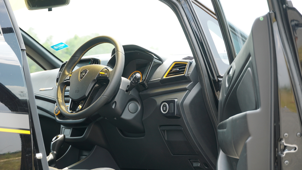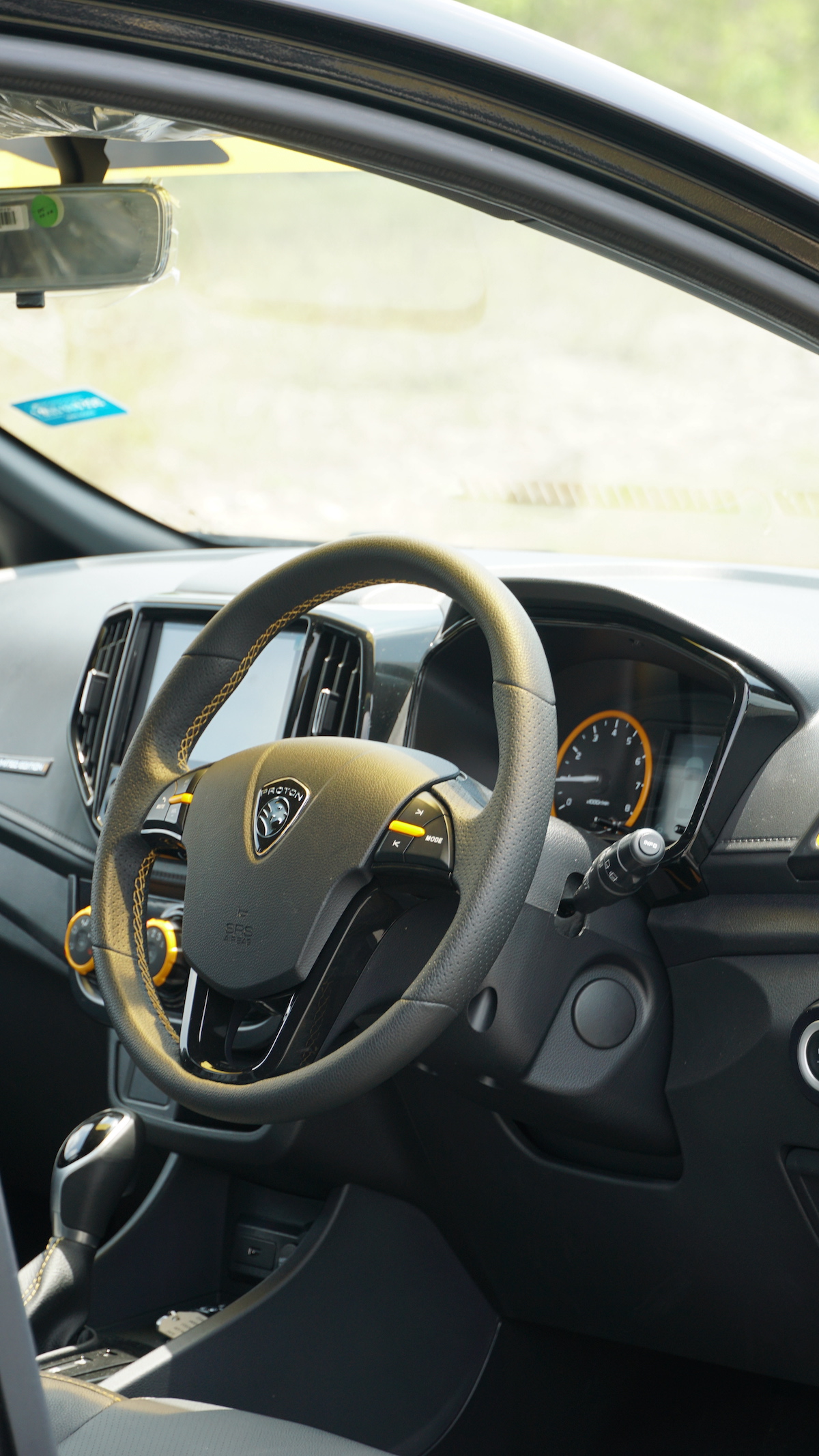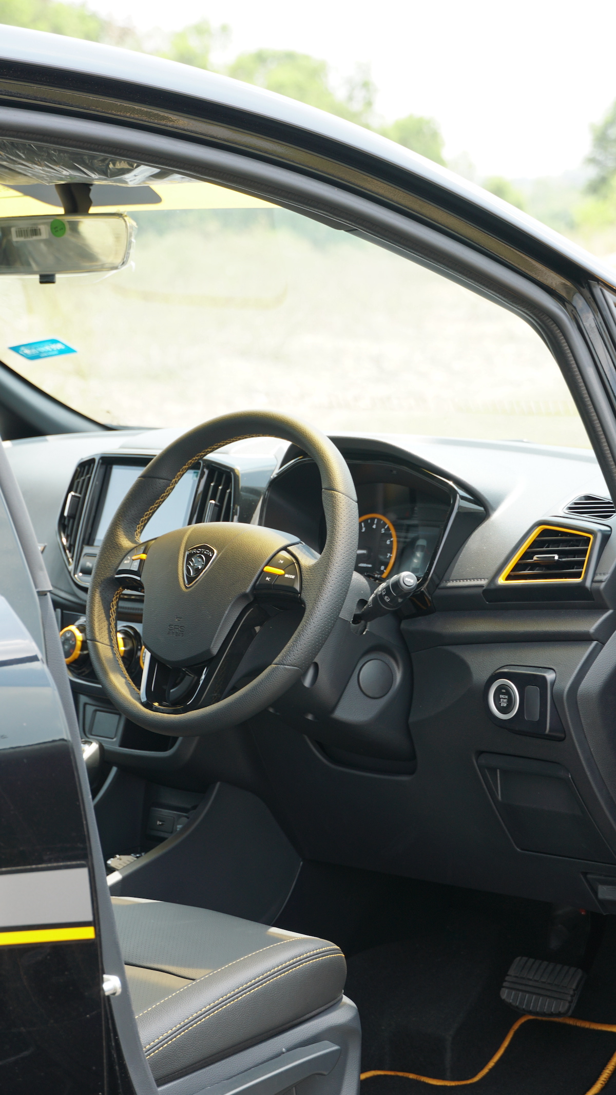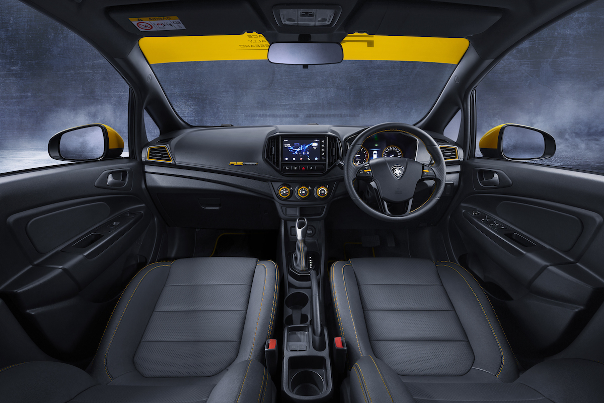 - Kerusi kulit sintetik (leatherette) hitam dengan sulaman kontras benang kuning, termasuk konsol gear.