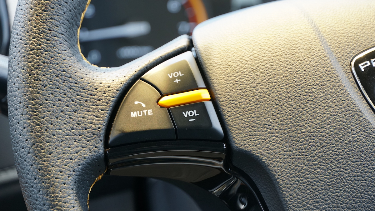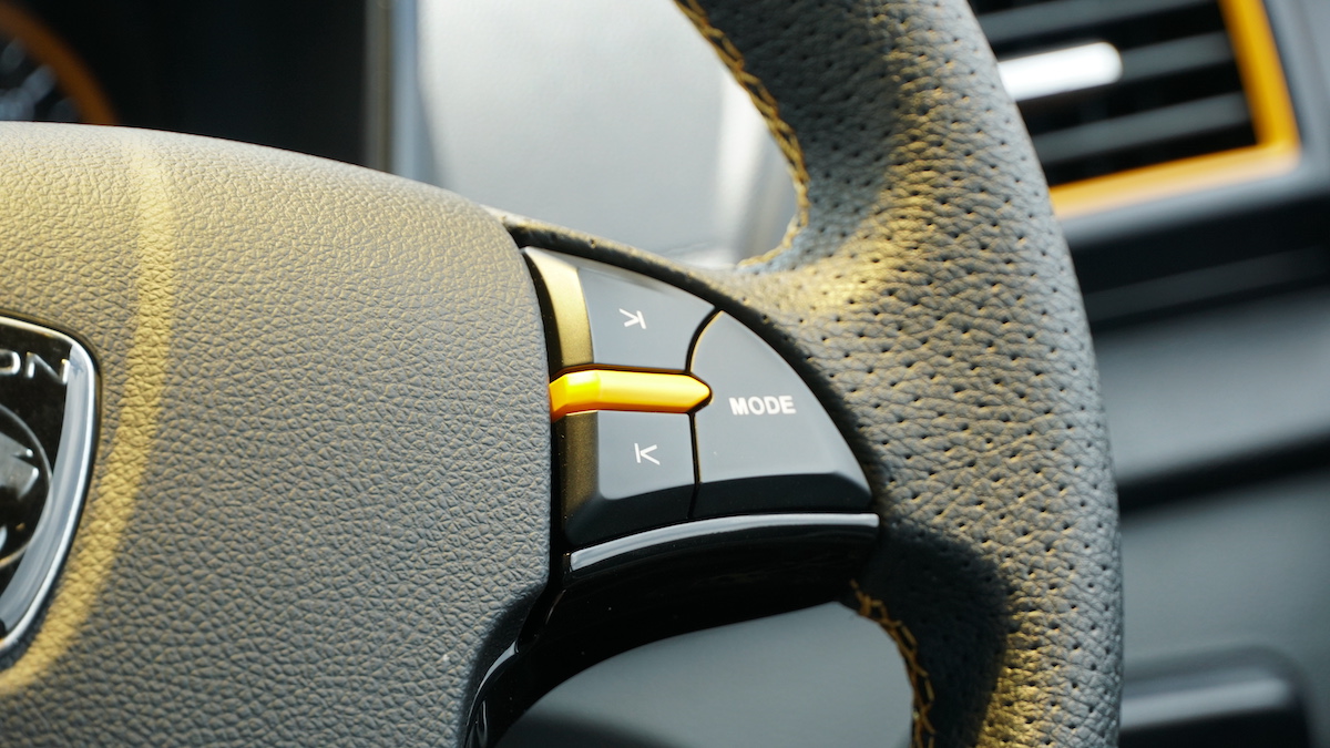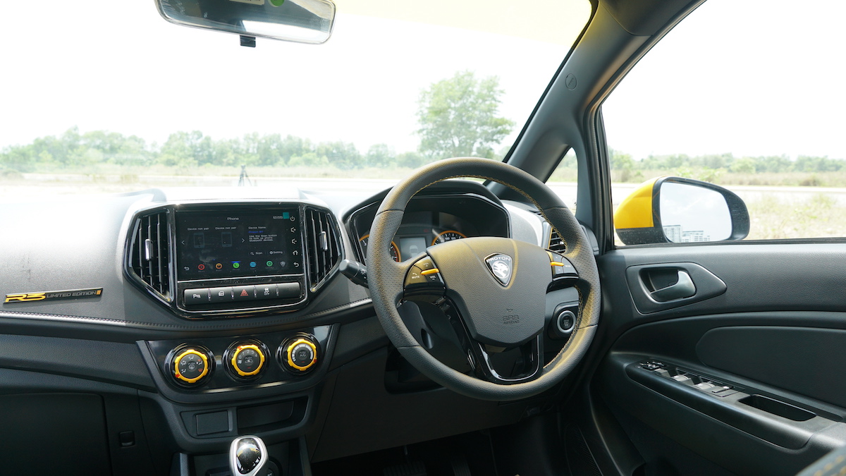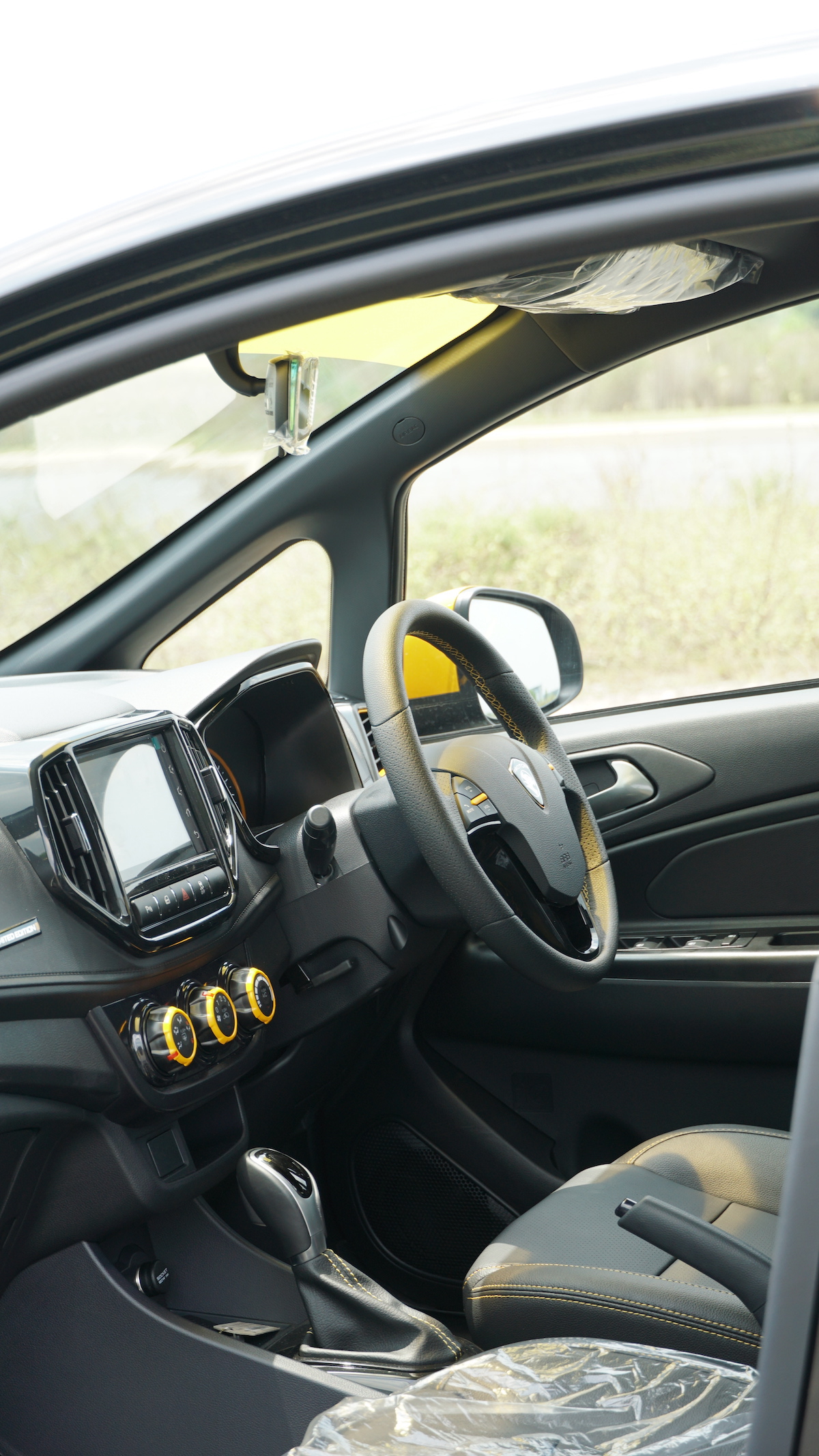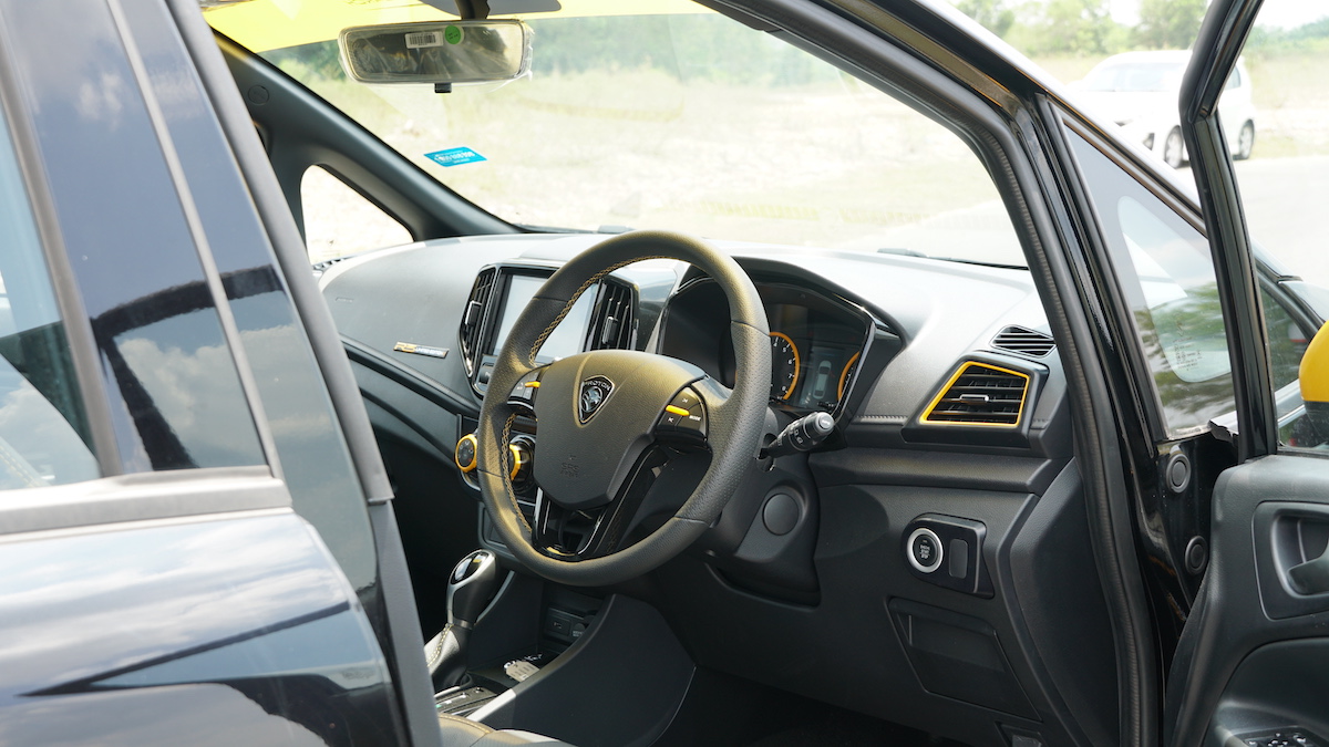 - Kerusi kulit sintetik (leatherette) hitam dengan sulaman kontras benang kuning, termasuk konsol gear.