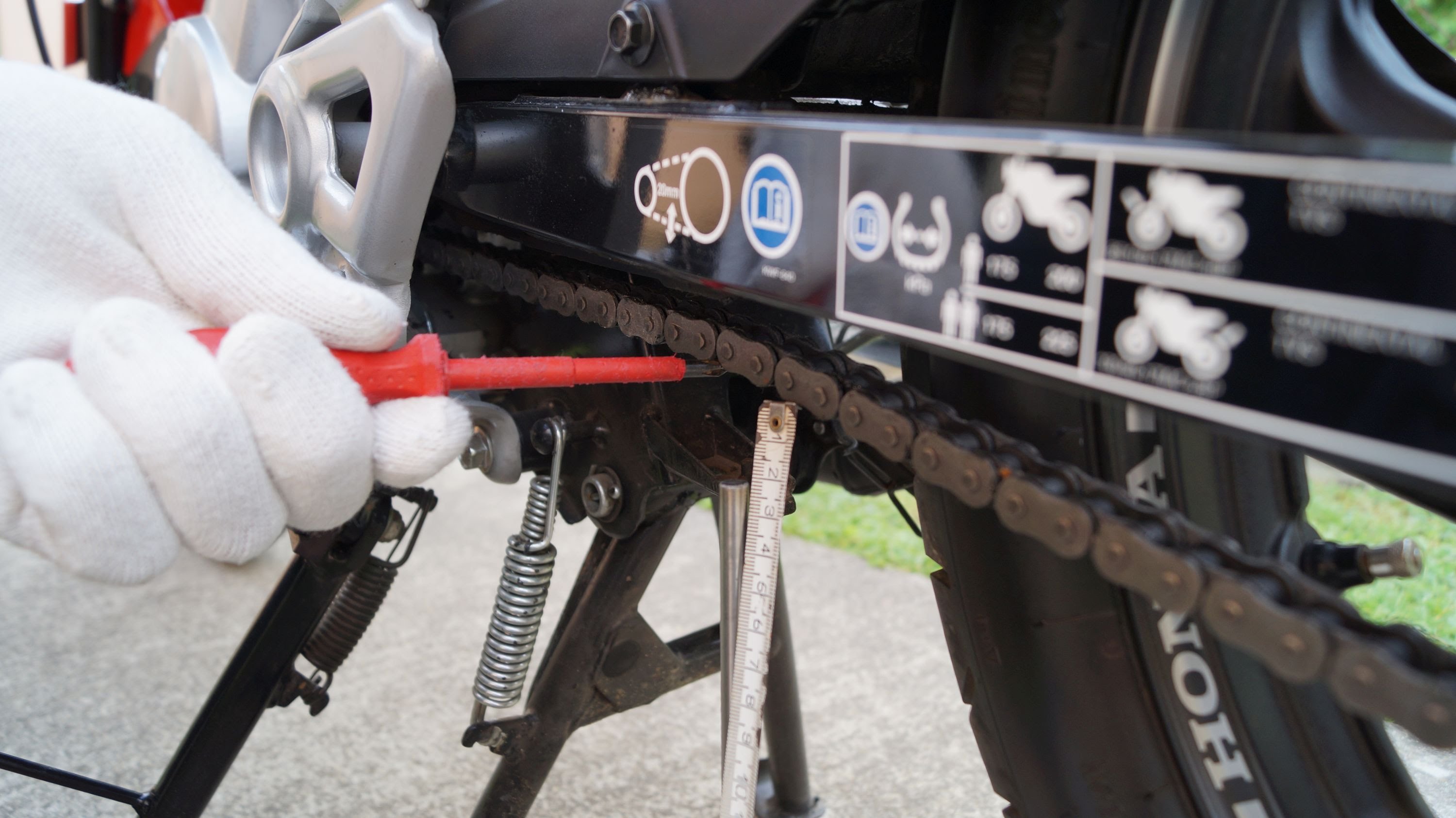 Periksa ketegangan rantai dengan memeriksa kenduran rantai pacu (drive-chain slack), iaitu jarak antara rantai semasa ditekan dan semasa dibiarkan kendur. Semak jarak yang sesuai dengan merujuk manual penjagaan motosikal, atau label yang dilekatkan pada lengan ayun (swing-arm). Jika terlalu kendur, ketatkan semula sama ada buat sendiri atau bawa ke bengkel berdekatan.
