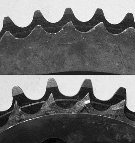 - Jika hujung gigi sproket sudah tajam atau runcing (gambar bawah), pun perlu ditukar baharu.