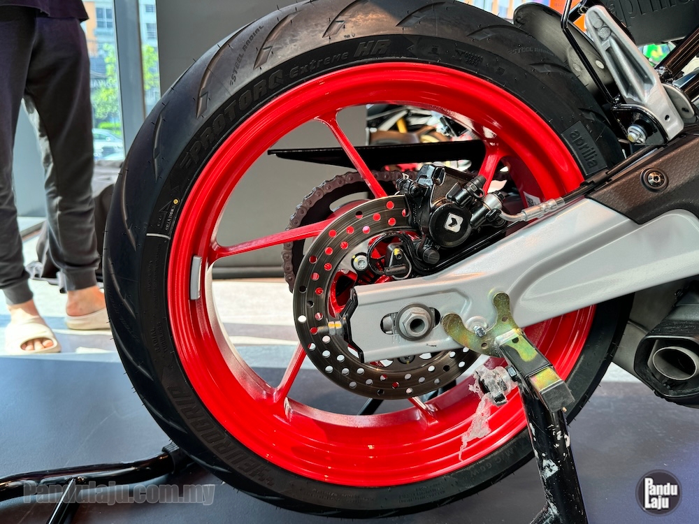 - Dipasangkan tayar saiz 110/70 (depan), dan 150/60 (belakang) pada rim 17 inci.