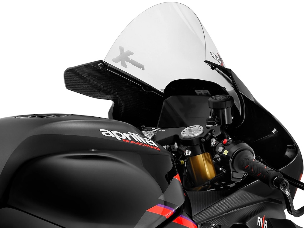 RSV4 X-GP dipadankan dengan suspensi Öhlins boleh laras sepenuhnya, brek Brembo GP4 MS dengan cakera 330mm T-Drive, rim magnesium forged Marchesini, serta tayar slick Pirelli Diablo SBK (125/70 SC-1 depan, 200/65 SC-X belakang).