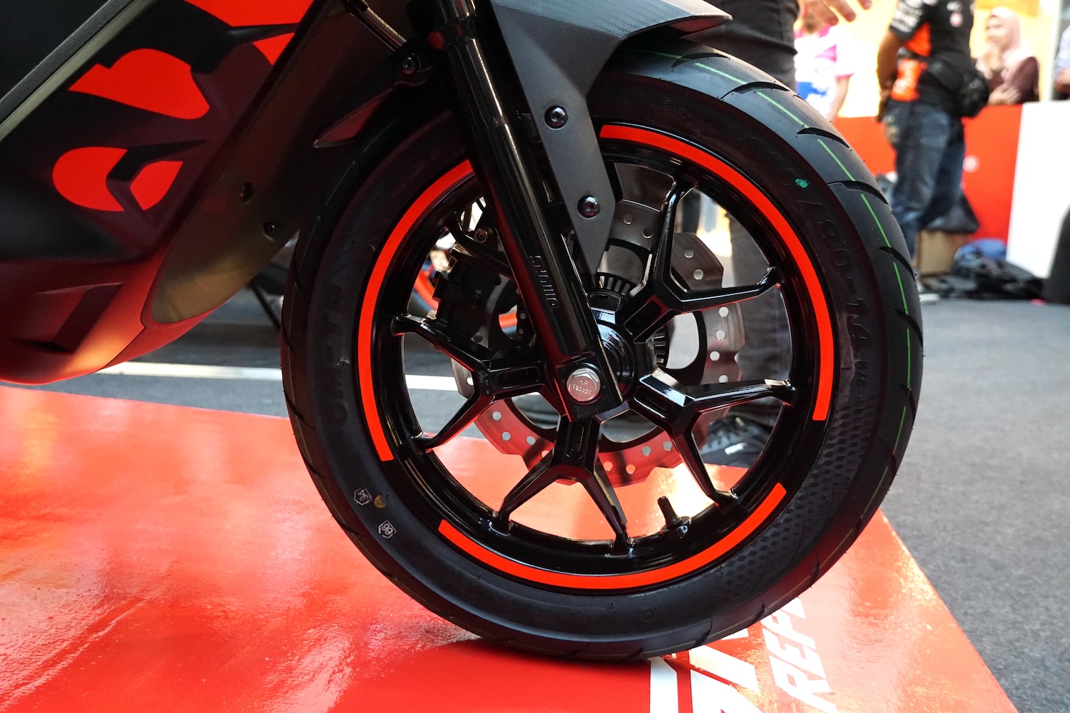- Rim berwarna hitam dengan pelekan aksen merah. Tayar digunakan jenis all terrain.