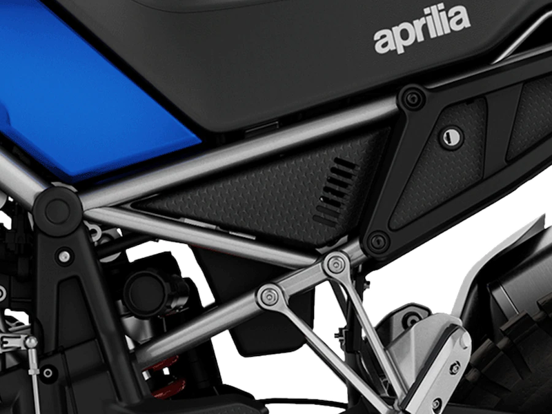 - Kekal dengan casis tradisi Aprilia dengan frem keluli tubular baharu dan braket aluminium serta ada pautan 6-poin enjin. Jarak roda sekitar 1,500mm, manakala nisbah agihan berat dan pusat graviti direka seimbang.