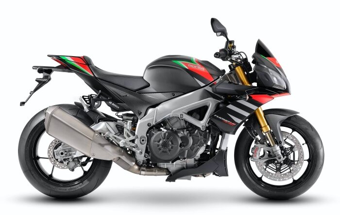- Tuono V4 1100 Factory didatangkan dengan kemasan gentian karbon bersama grafik baharu