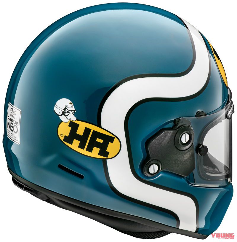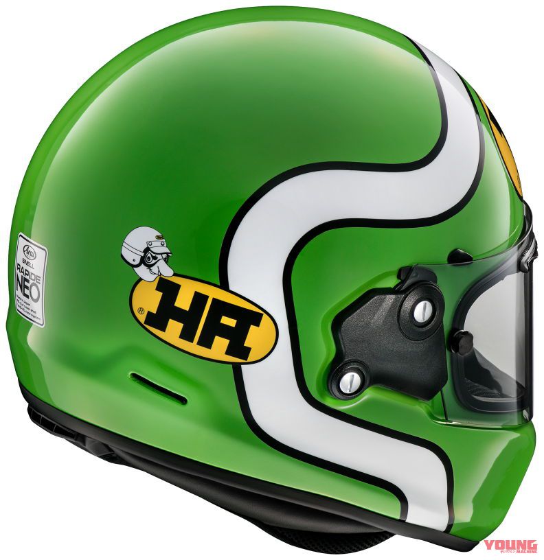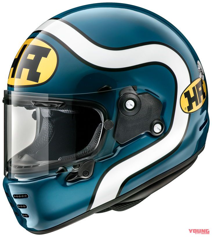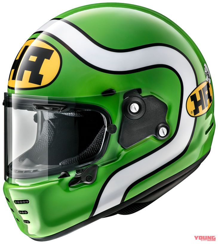 Ditawarkan dalam warna biru dan hijau dengan corak grafik ala Kawasaki Z900 RS Cafe, helmet ini diserikan grafik jalur putih dan logo Kejuaraan Superbike AMA 1980-an, bertulis ‘HA’.