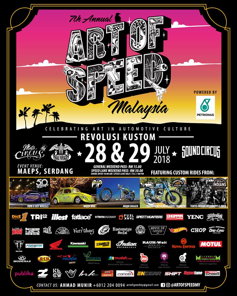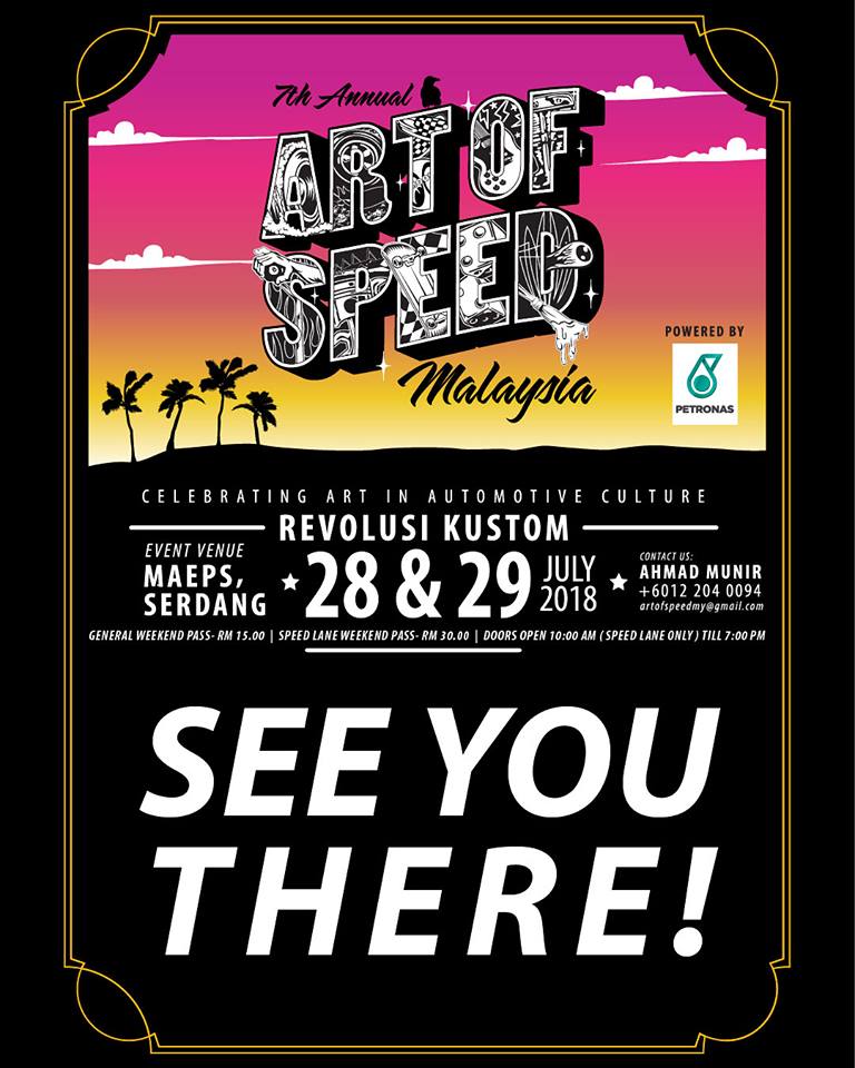 KEPADA penduduk Lembah Klang atau sesiapa saja peminat dunia permotoran yang tidak ke mana-mana hujung minggu ini, bolehlah datang bersama keluarga atau rakan ke acara Art of Speed Malaysia 2018 kali ke-7 yang berlangsung pada 28 (hari ini) dan 29 Julai ini, dibuka jam 10 pagi hingga 7 malam di MAEPS Serdang.