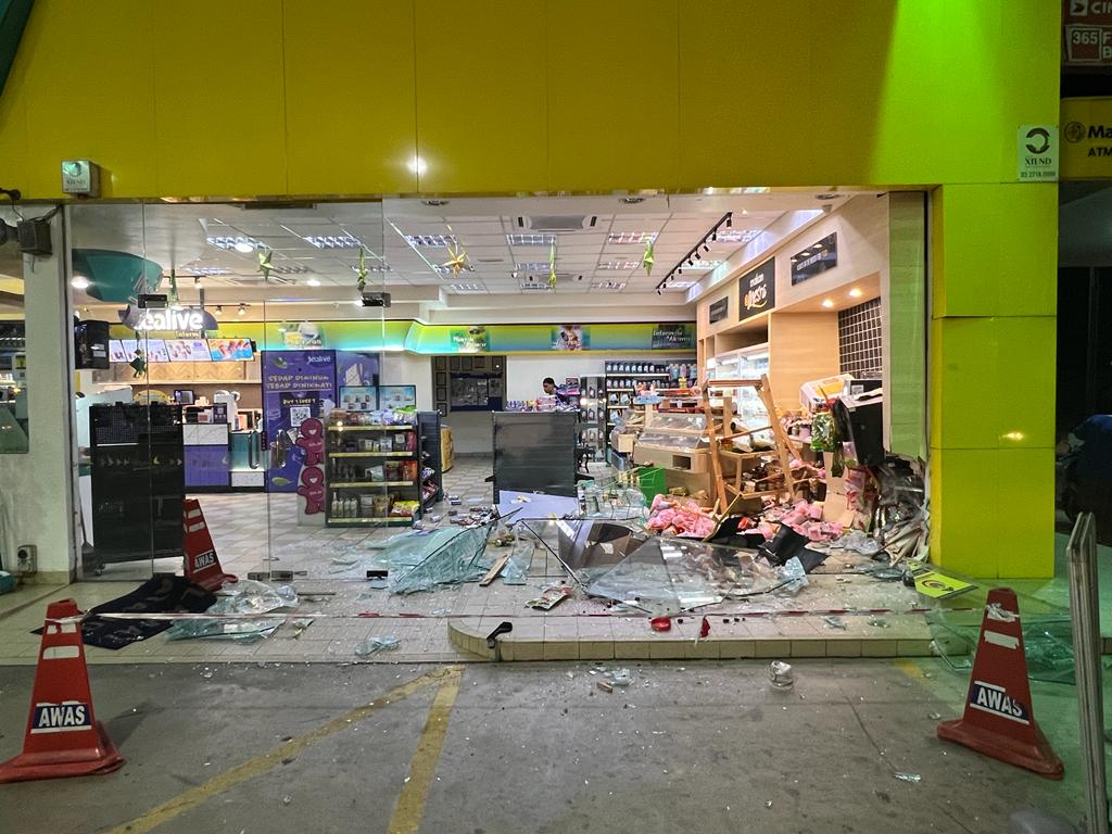 Tindakan itu menyebabkan kereta dipandu mangsa, jenis Hyundai Sonata, terbabas dan melanggar kedai tersebut hingga memecahkan lima panel gelas kaca.