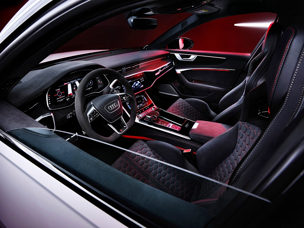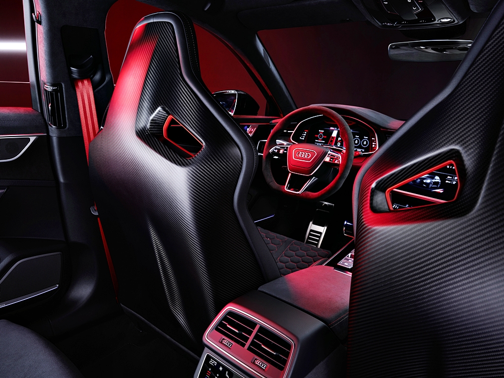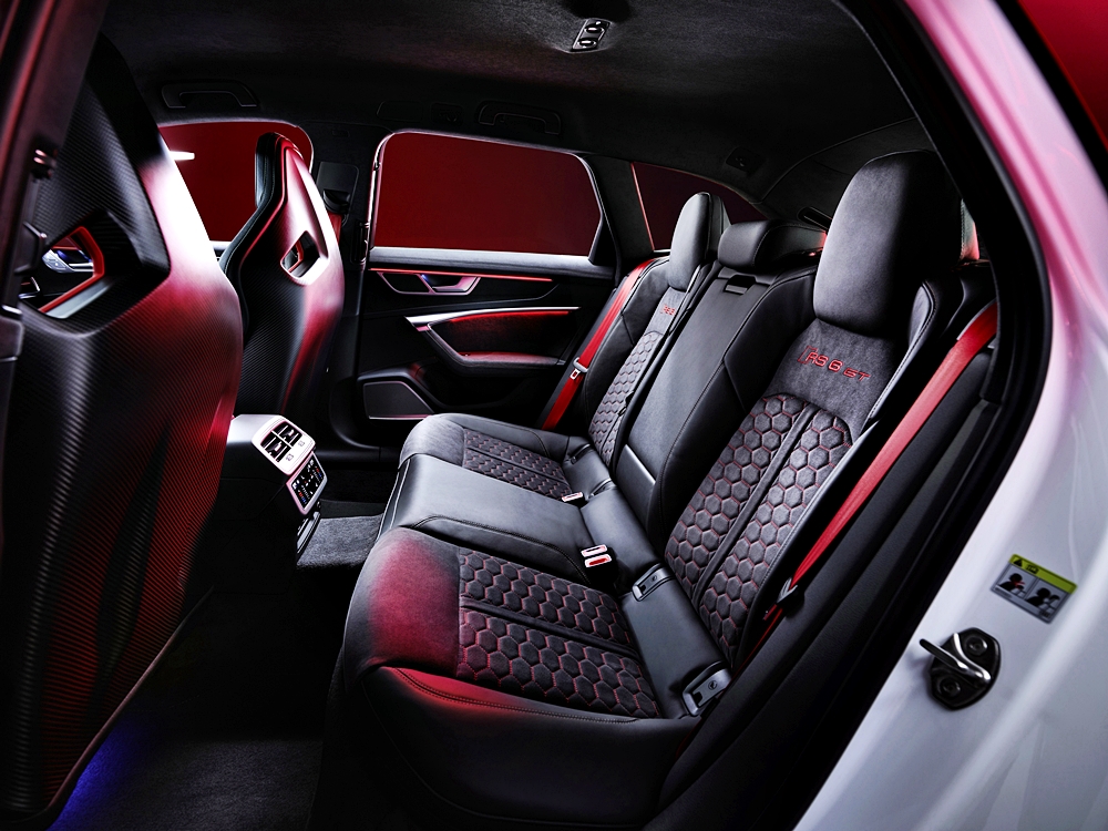 - Kerusi bucket RS dengan balutan kulit Dinamica dan logo RS 6 GT.