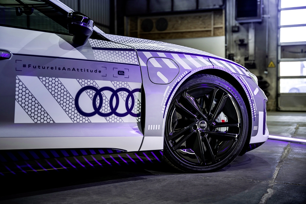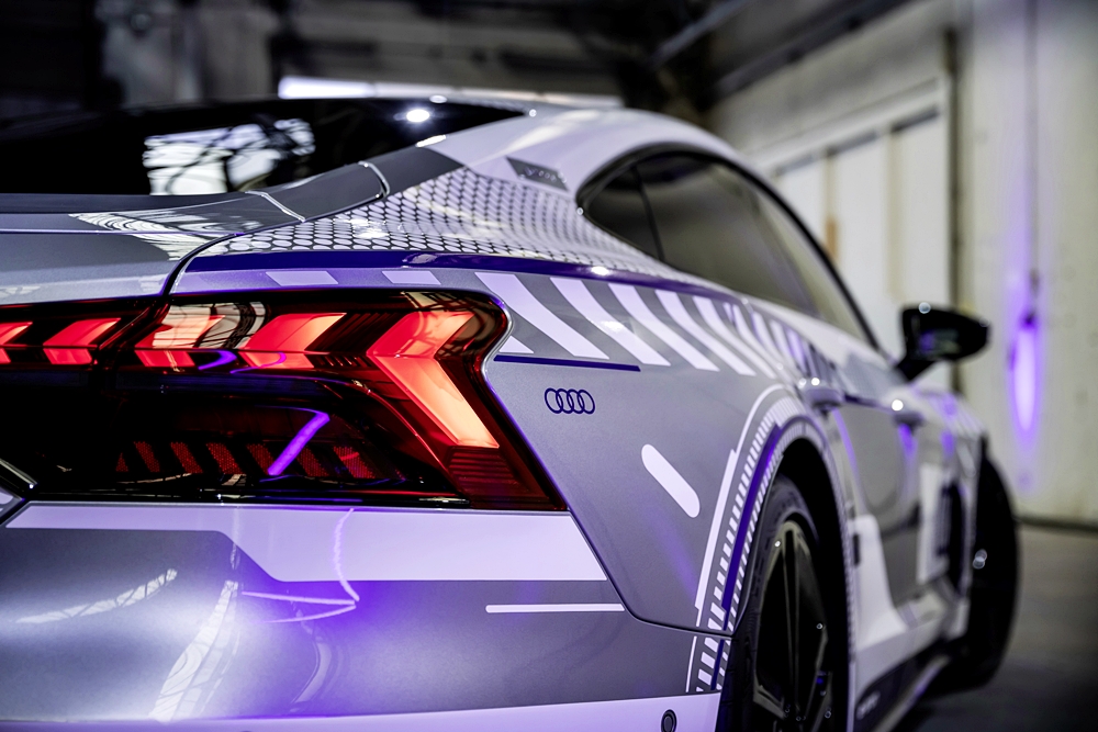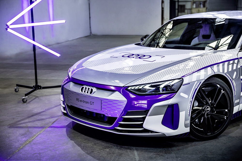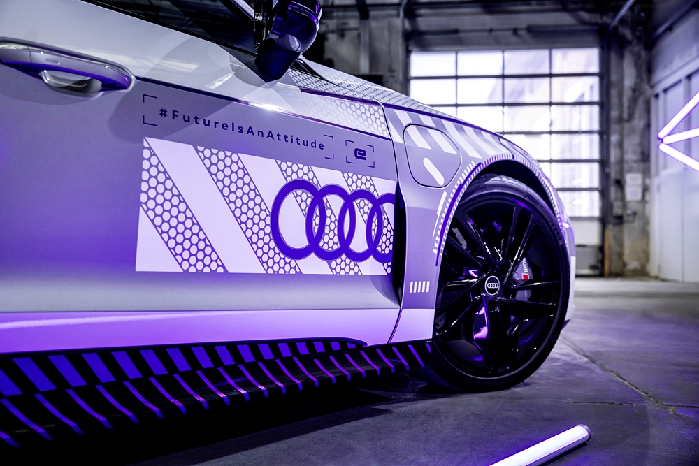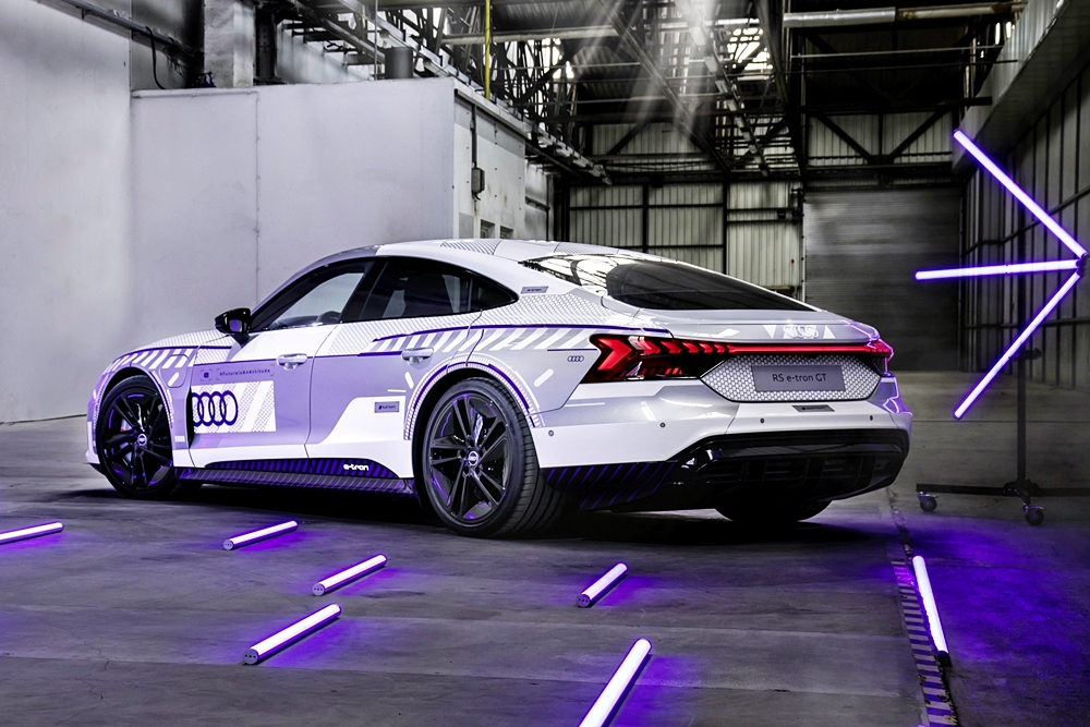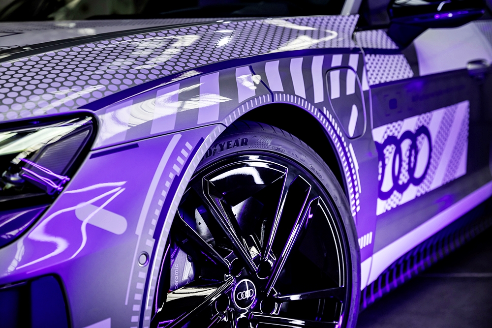 Kanvas kepada model istimewa ini ialah RS e-tron GT dalam warna Florett Silver metalik dan bumbung CFRP hitam. Badan kereta dibalut grafik perak dan putih, merujuk kepada kristal salji dan tasik ais. Warna violet pula mewakili warna terang cermin mata sukan musim sejuk.
