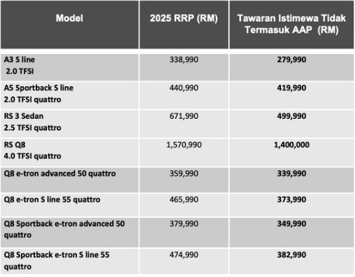 Kemas kini harga berkuat kuasa bermula 1 Januari 2025, dan lapan model Audi ditawarkan pada harga istimewa dalam tempoh terhad dari 1 Januari hingga 28 Februari 2025.