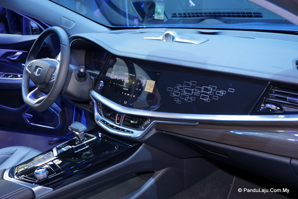 2. Bahagian kabin menumpukan kepada fiil mewah dan berteknologi menerusi papan pemuka pandangan penuh (full vision) yang kali pertama diperkenalkan pada model konsep Emgrand (2015), yakni jenama di bawah Geely yang sudah ditamatkan pengeluaran .