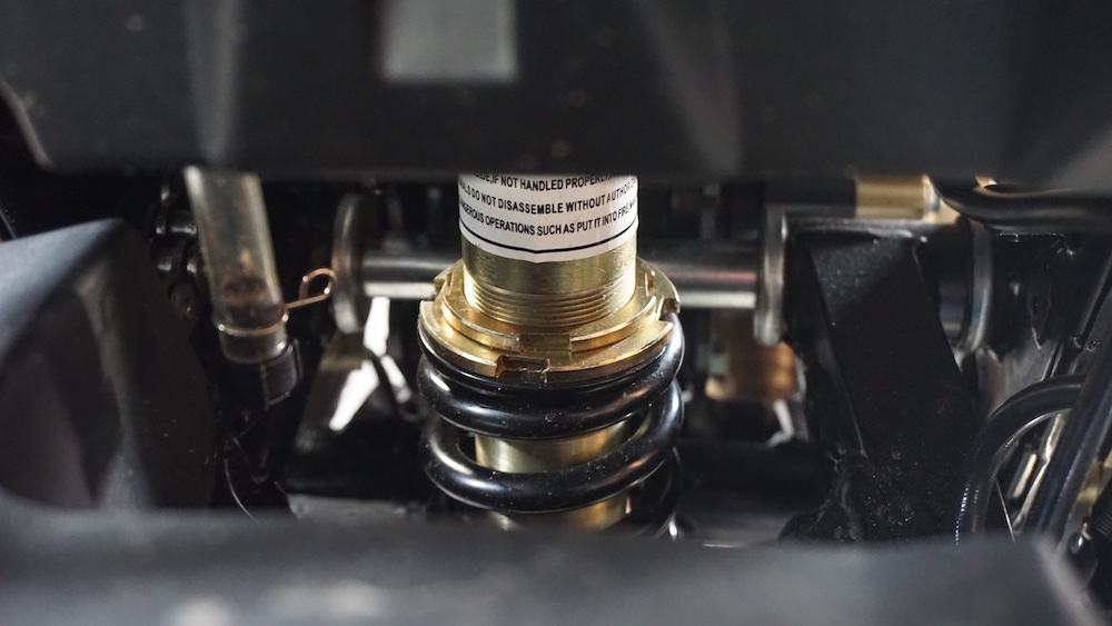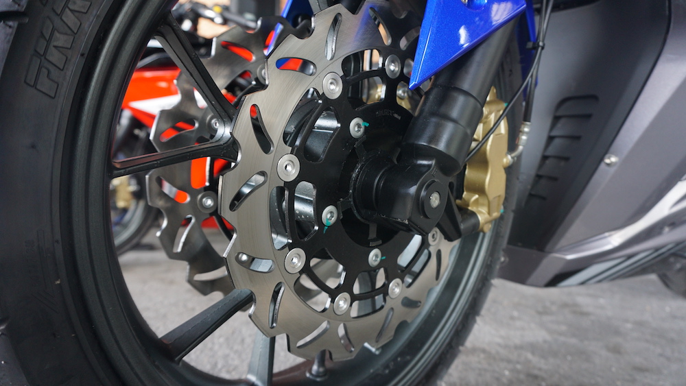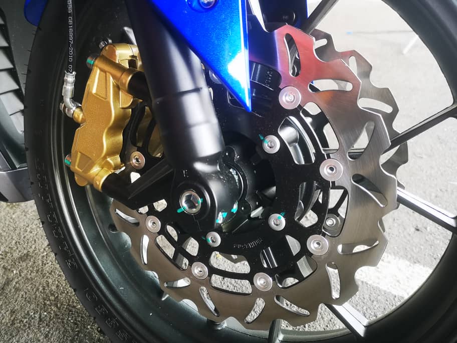 - Sistem brek cakera kembar dengan kaliper 4-piston (depan), dan cakera tunggal kaliper 2-piston (belakang).