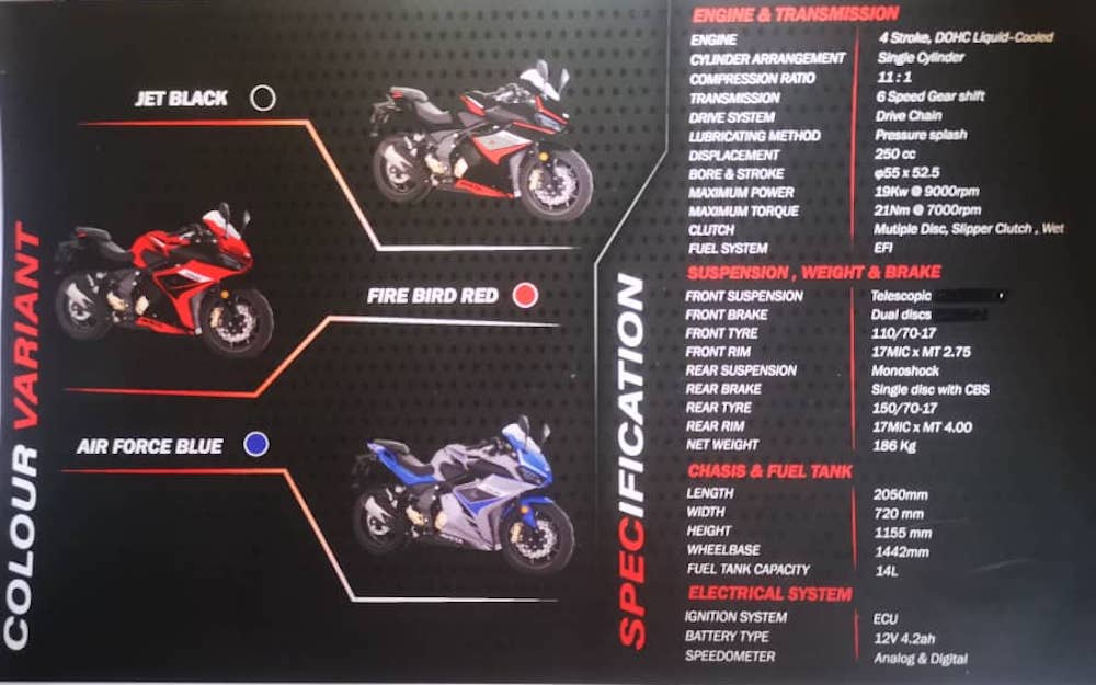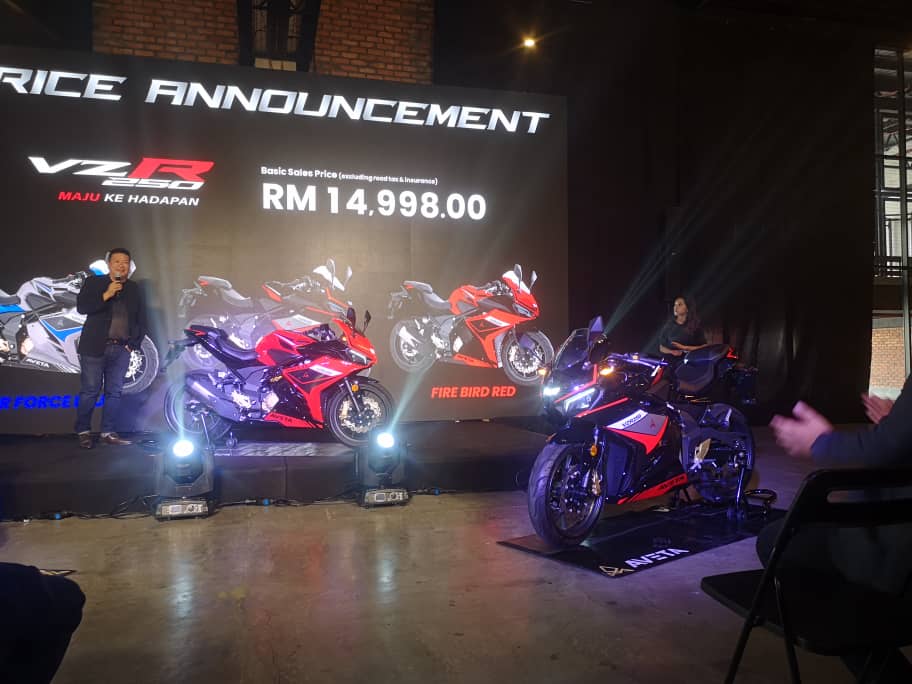 AVETA Malaysia sebentar tadi melancarkan sportbike pertama mereka, Aveta VZR250 (2023) yang didatangkan dalam tiga warna pilihan: Fire Bird Red (merah), Air Force Blue (biru) dan Jet Black (hitam) ke pasaran tempatan.