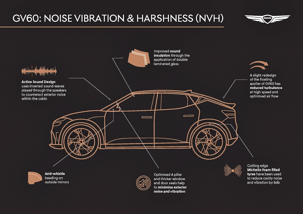 Justeru Genesis membangunkan teknologi baharu dalam aspek bunyi, getaran dan kekasaran (NVH) dan ujian untuk model elektrik jenama itu, GV60. Bagi memahami lebih mendalam, lebih senyap sesebuah kereta elektrik, lebih jelas bunyi lain yang akan masuk dalam kabin seperti tayar, angin dan getaran.