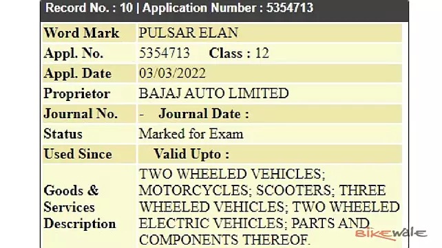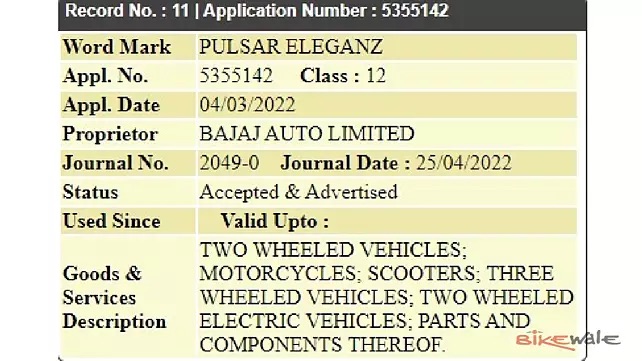 BAJAJ Auto dilaporkan memohon tanda dagang dua nama baharu untuk siri motosikal Pulsar, iaitu Pulsar Elan dan Pulsar Eleganz, dibuat Mac lalu.